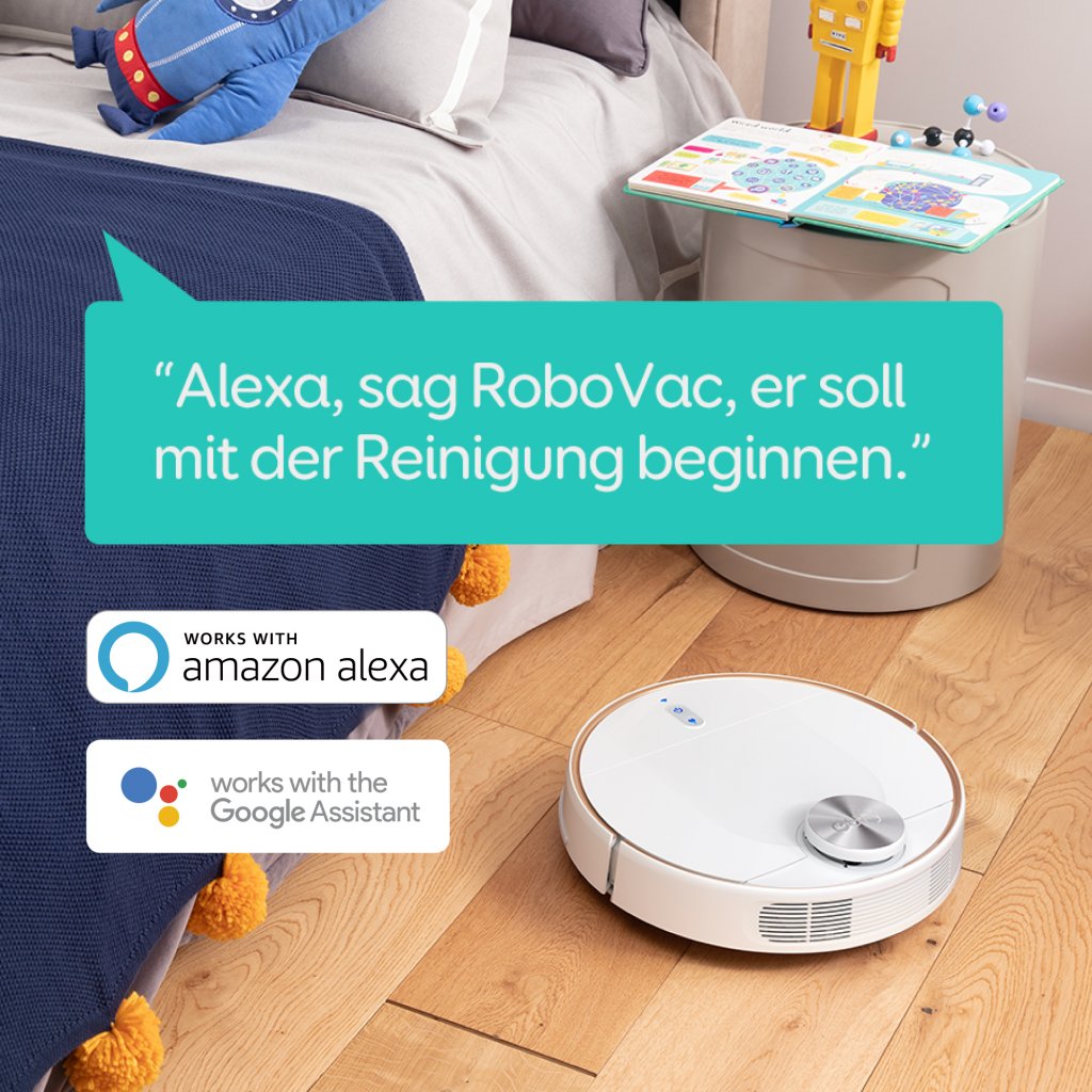 Ein weiterer netter Zusatz des Saugroboters ist, dass man ihn ganz leicht per Sprachsteuerung mit der Alexa oder dem Google Assistant steuern kann. Nun könnt ihr eurem Saugroboter bequem vom Sofa aus die richtigen Anweisungen geben.