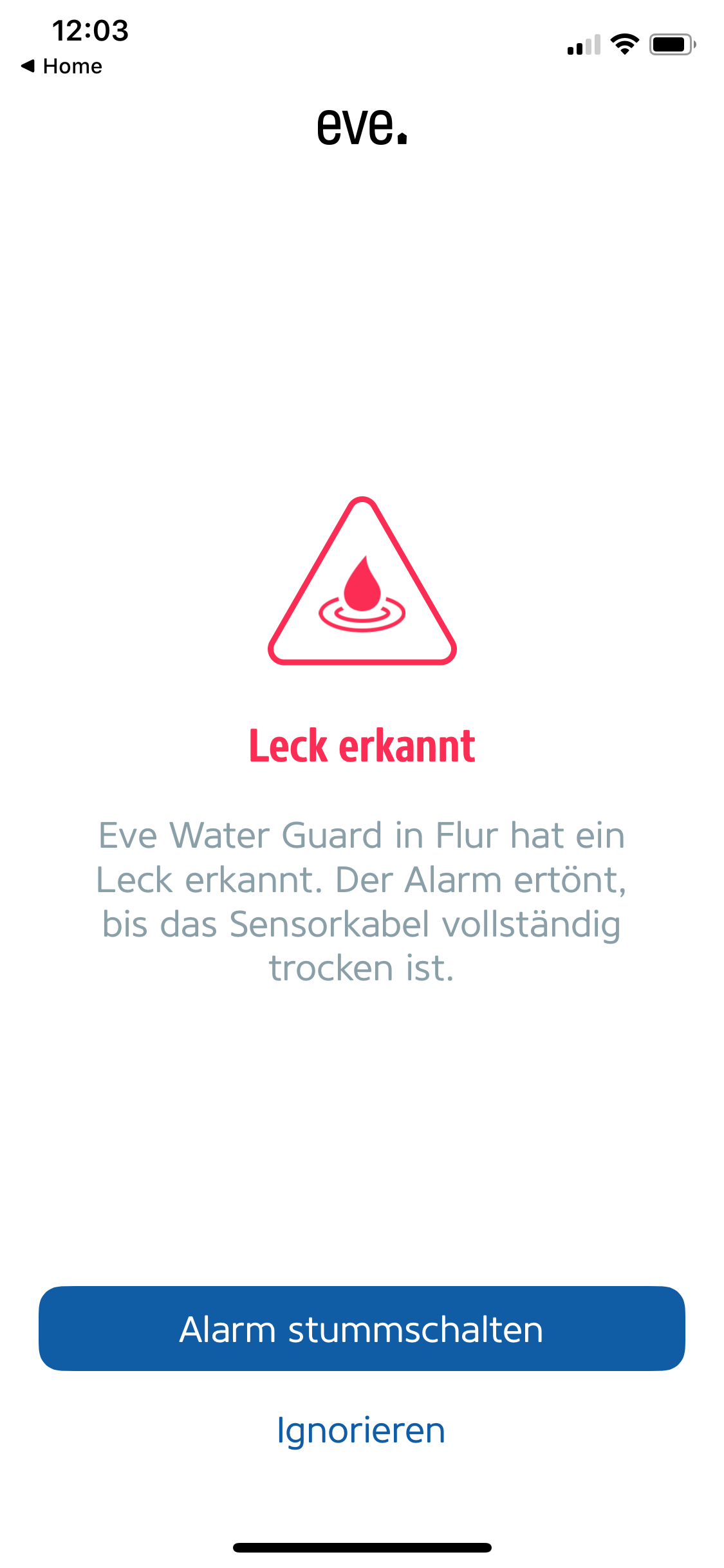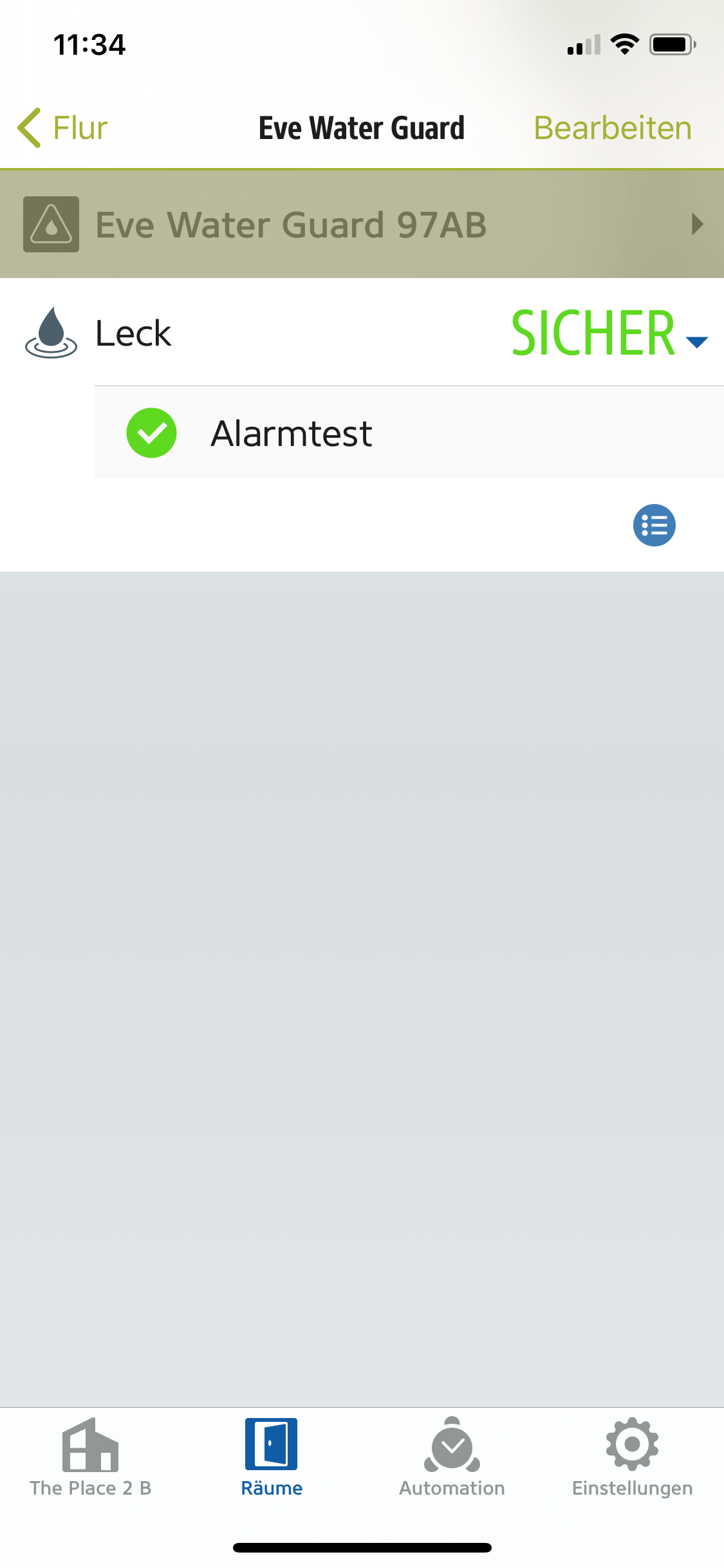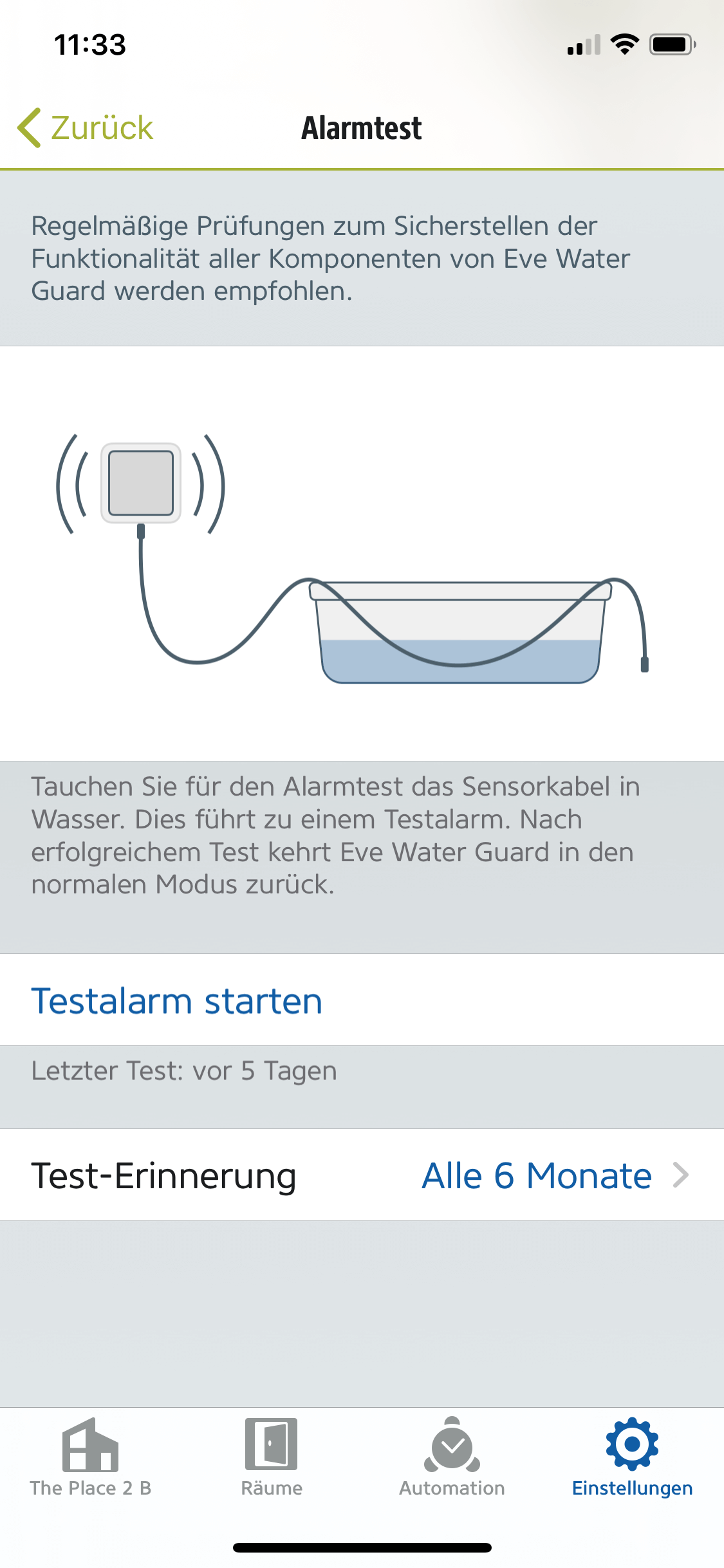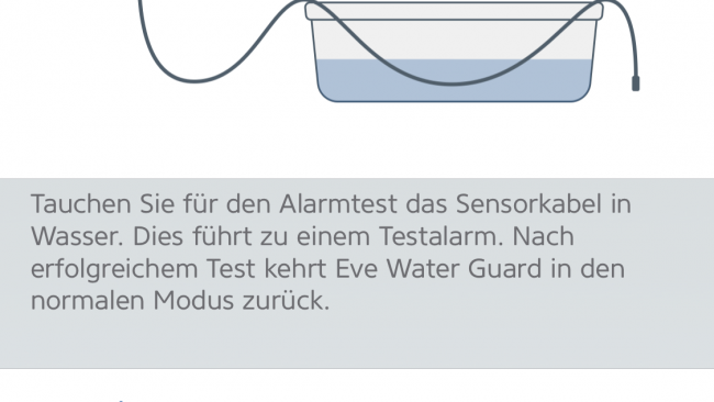 Den Vorgang mit einem Alarmtest abzuschließen, gelingt mir zunächst nicht. Zwar bestätigt die Eve-App den Test, erklärt ihn dann jedoch als „niemals“ ausgeführt. Im anschließenden Betrieb vermeldet das Sensorkabel in der App mehrfach einen „Kabelfehler“ und schlägt wiederholt fälschlich Alarm, obwohl nirgends ein Wasserleck zu erkennen ist. Ein Austauschgerät verhält sich genauso.