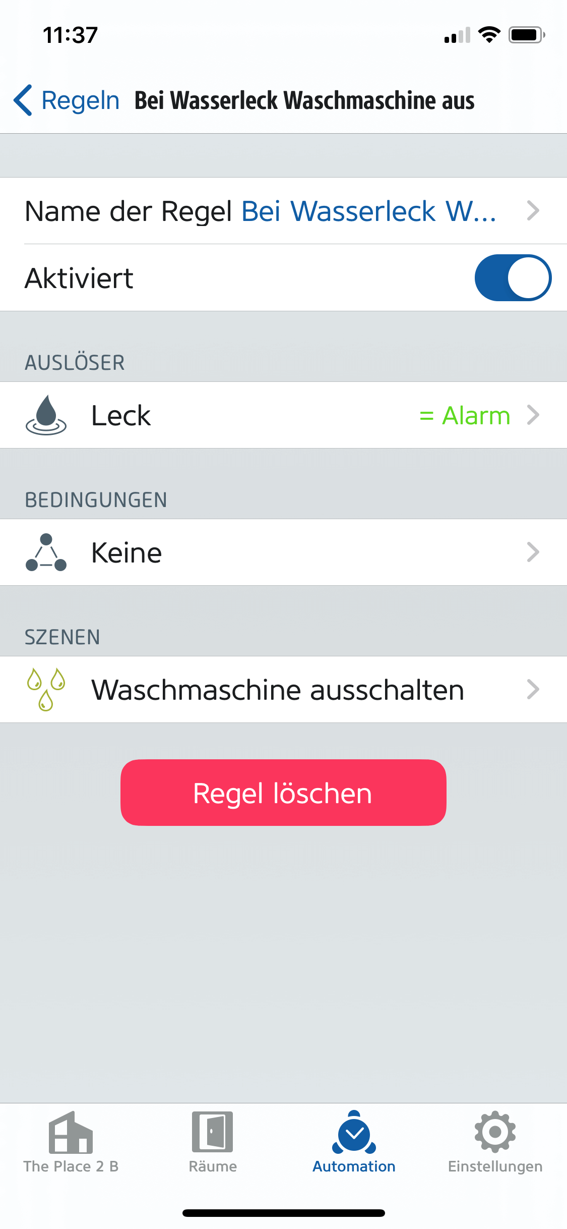 Dafür lässt sich der Eve Water Guard im Test auf andere Weise clever in Apples Smart-Home-System einbinden. So kann ich den Sensor mit dem Funkzwischenstecker Eve Energy logisch verknüpfen. Tritt laut dem Sensor Wasser aus der Waschmaschine aus, trennt die smarte Steckdose sie vom Strom und stoppt den Waschvorgang.