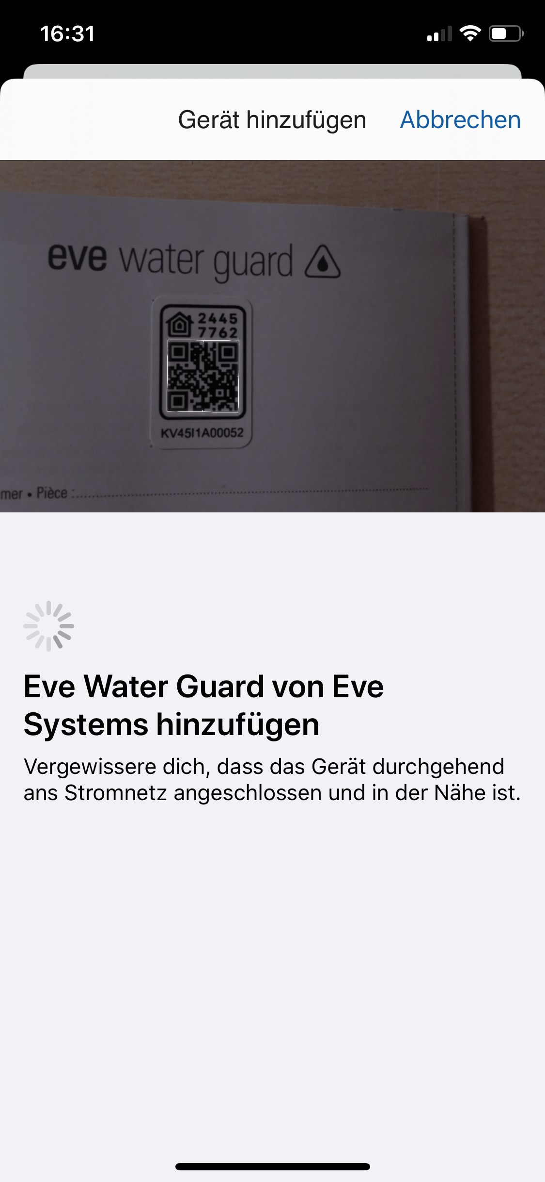 Auch der smarte Teil der Montage ist grundsätzlich schnell erledigt. Dazu öffne ich die Hersteller-App von Eve, füge per Plus-Zeichen ein Gerät hinzu und lese per iPhone-Kamera den HomeKit-Code ein.