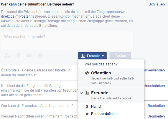 Die vermutlich wichtigste Einstellung ist “Wer kann meine Inhalte sehen?”. Hier hat man die Wahl zwischen der “Öffentlichkeit”, dann kann sie jeder Facebook-Nutzer lesen, oder aber nur die “Freunde”, dann ist die Leserschaft auf die eigenen Facebook-Kontakte begrenzt. Allerdings gibt es auch die Option, dass nur man selber seine eigenen Beiträge lesen kann, was aber größtenteils gegen den Sinn der Nutzung eines sozialen Netzwerks ist. Für die Profis und Vorsichtigen unter uns gibt es jedoch die Möglichkeit, die Einstellung “Benutzerdefiniert” zu gestalten. Hier hat man die Möglichkeit zu entscheiden, wer im einzelnen befugt oder nicht befugt ist, die Inhalte seines eigenen Profils zu sehen.