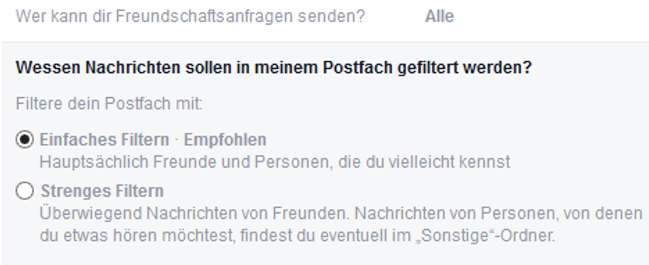 Klickt man bei “Wer kann dir Freundschaftsanfragen senden?” auf Bearbeiten, hat man auch hier wieder die Möglichkeit zwischen der Option “Alle” oder “Nur Freunde von Freunden” auszuwählen. Aber nicht nur die Freundschaftsanfragen können kontrolliert werden, sondern auch Nachrichten von anderen Kontakten. Mit einem Klick auf die Funktion “Bearbeiten” erhält der Nutzer zwei Auswahlpunkte, in denen er entscheiden kann, wessen Nachrichten in seinem Postfach gefiltert werden sollen. Bei der einfachen Filterung, die Facebook übrigens empfiehlt, werden hauptsächlich Nachrichten von Freunden oder Personen, die man vielleicht kennt, gefiltert. Bei der strengen Filterung wird darauf geachtet, dass überwiegend Nachrichten von Freunden gesammelt werden. Sollte jemand Unbekanntes eine Nachricht versenden, so findet man diese im “sonstigen Ordner”