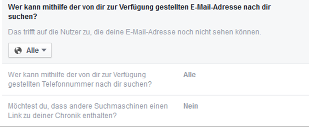 Bei der Frage “Wer kann nach mir suchen?” geht es ähnlich wie bei den anderen Einstellungsoptionen vonstatten. Da das auf verschiedenen Wegen funktioniert, wenden wir uns zunächst an den ersten Punkt: “Wer kann mithilfe der von dir zur Verfügung gestellten E-Mail-Adresse nach dir suchen?”. Unter “Zur Verfügung gestellt” versteht man hier nichts anderes, als die vom Nutzer eingegebene E-Mailadresse, da man diese für eine Account-Erstellung für Facebook benötigt. Auch hier wird wieder unterschieden zwischen “Alle“, “Freunde” oder “Freunde von Freunden”.