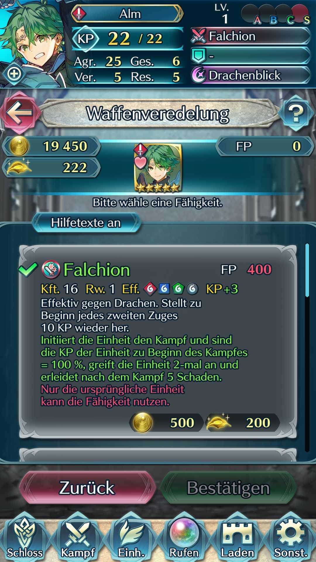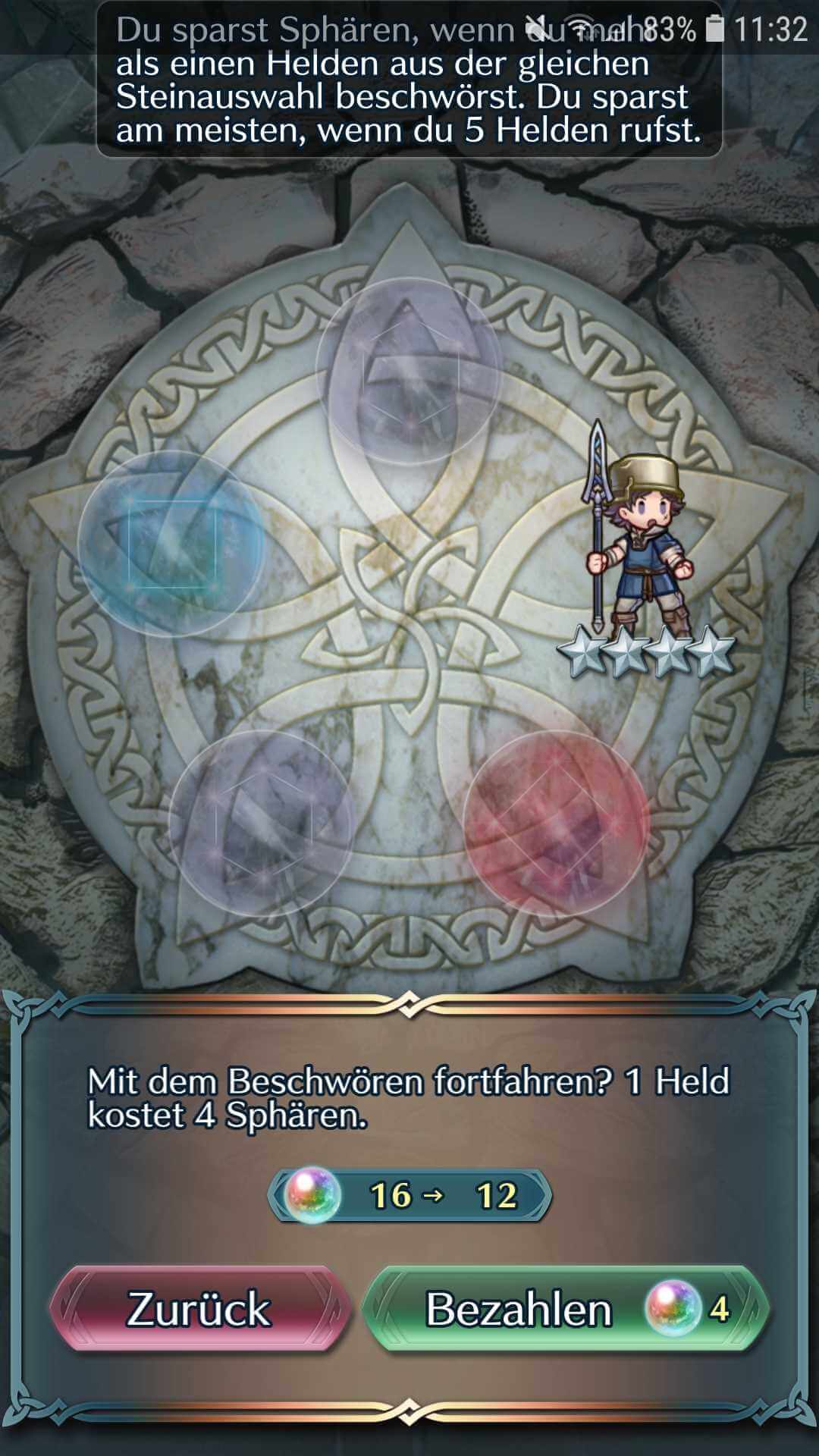 Zum dritten Mal müssen wir an diesem Punkt über das Gacha-System sprechen. Auch Fire Emblem Heroes setzt auf das in Mobile-Games beliebte Prinzip. Wir sammeln eine gewisse Art von Währung, in diesem Fall Sphären, die wir nutzen, um zufällig neue Charaktere zu ziehen. Dies wird bei Fire Emblem Heroes sogar noch etwas erweitet. Nach dem du fünf Sphären bezahlt hast, landest du auf einem Bildschirm mit fünf verschiedenen farbigen, zufällig geneierten Steinen. Diese haben die Farben der Charakter-Kategorien und können frei ausgewählt werden. So kannst du einerseits einschränken, nach welcher Figur du ziehen möchtest. Andererseits kann es auch passieren, dass du deine gewünschte Farbe gar nicht erst bekommst und dann ziemlich dumm da stehst. Außerdem haben die Figuren unterschiedliche Stern-Bewertungen von drei bis fünf (oder Bronze bis Gold). Die Fünf-Sterne-Charaktere sind dabei immer noch ein bisschen schwieriger zu erlangen.