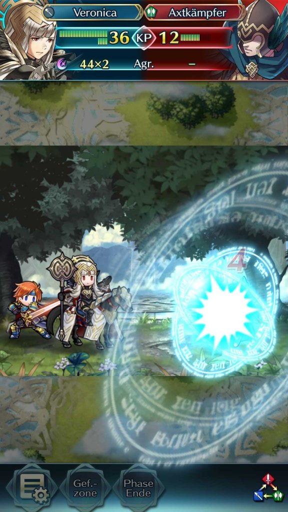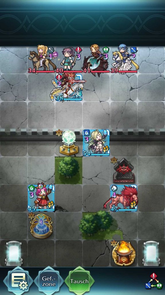 Fire Emblem Heroes spielt sich im Grunde wie ein abgespecktes Fire-Emblem-Game. In diesem Mobile-Game kontrollieren wir vier Einheiten auf kleinen, mit Gegner gespickten Maps. Die Charaktere sind in vier Standard-Farben eingeteilt: rot, blau, grün und farblos (eher grau). Zu den roten Charakteren gehören Schwertkämpfer, Feuer- und Schwarzmagier, zu den blauen gehören Lanzenkämpfer und Lichtmagier, in der grünen Kategorie sind Axtkämpfer und Windmagier und in der farblosen Kategorie sind Heiler, Bogenschützen und Dolchkämpfer. Dazu kommen noch Drachen- und Biesteinheiten in verschiedenen Farben. Diese farblichen Kategorien sind nicht ganz unwichtig für das Gameplay des Spiels. Denn ähnlich wie beim Waffen-Dreieck der Hauptreihe, sind Kategorien im Schere-Stein-Papier angeordnet. Rot ist effektiv gegen grün, grün ist effektiv gegen blau und blau ist stark gegen rot.