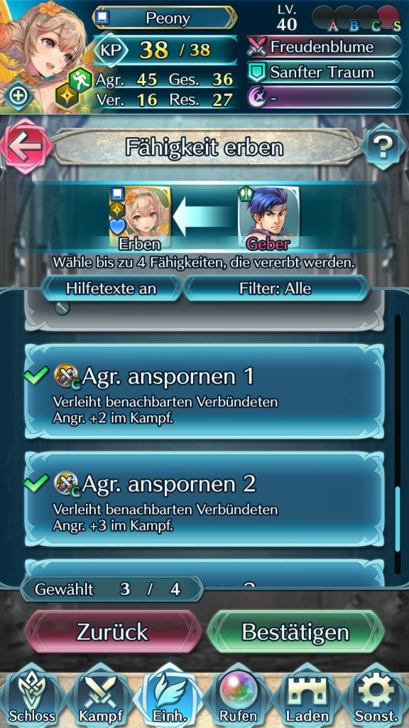 Eure Charaktere leveln sich in den Kämpfen oder mit speziellen Items bis Level 40 auf. Dann geht es ans Eingemachte: die Skills. Jeder Charakter kann neben seiner Waffe einen Unterstützer-Skill, eine Spezial-Attacke und drei weiter A-, B- und C-Fähigkeiten haben. Diese Skills können zum Beispiel die Stats der Figur anheben oder die anderer senken, können den Bewegungsradius beeinflussen oder die Gruppe heilen. Jeder Charakter kommt mit seinen eigenen Skills, die dann an eine andere Figur vererbt werden können. Aber Achtung! Der Fähigkeiten-Geber geht dadurch verloren. Das sorgt natürlich dafür, ob man sich zweimal überlegt, den wertvollen Charakter nur für seinen seltenen Skill zu opfern. Es gibt aber auch Figuren, die vielleicht nicht die stärksten Kämpfer sind eine Daseinsberechtigung. Schließlich kann man sie als Fähigkeiten-Futter gebrauchen.