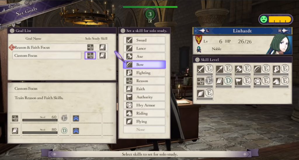 Abseits der Kämpfe erkunden wir in Fire Emblem Three Houses vor allem die Klosterschule. Jeden Sonntag entscheiden wir uns zwischen dem Besuch eines Extra-Kurses, Nebenmissionen auf dem Schlachtfeld oder dem freien Erkunden der Schule. Hier können wir angeln, Gegenstände finden, Kräuter anbauen und mit unseren Schülern essen. In kleinen Turnieren treten wir gegen die Schüler der anderen Häuser an und können Preise gewinnen. Dabei erhöhen wir kontinuierlich den Support-Level zwischen unseren Einheiten. Für jede höhere Stufe von C bis A schaltet ihr Gespräche zwischen den Charakteren frei. So erfahren wir mehr über unsere Schüler. Wie in jedem Dialog bleibt Byleth stumm, wir entscheiden über seine Antwortmöglichkeiten und können so Bonus-Support-Punkte erspielen. Außerdem erhalten sie durch den höheren Support-Level Boni auf dem Schlachtfeld.