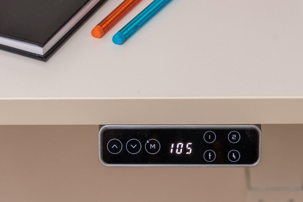 Ist der Variotisch montiert und aufgebaut, lässt er sich unkompliziert über die LCD-Bedieneinheit steuern. Dafür erlauben Pfeiltaster nach oben und unten das Auf- und Abfahren, eine Anzeige verrät die aktuelle Höhe der Tischplatte. Der verstellbare Bereich liegt zwischen 60,5 und 125 Zentimeter. Ferner ist eine Sicherung der Positionen über den Memorybutton möglich. Hierfür stehen vier Speicherplätze zur Verfügung. Zum einen lassen sich Steh- und Sitzposition definieren, zum anderen zwei selbst gewählte Stellungen.