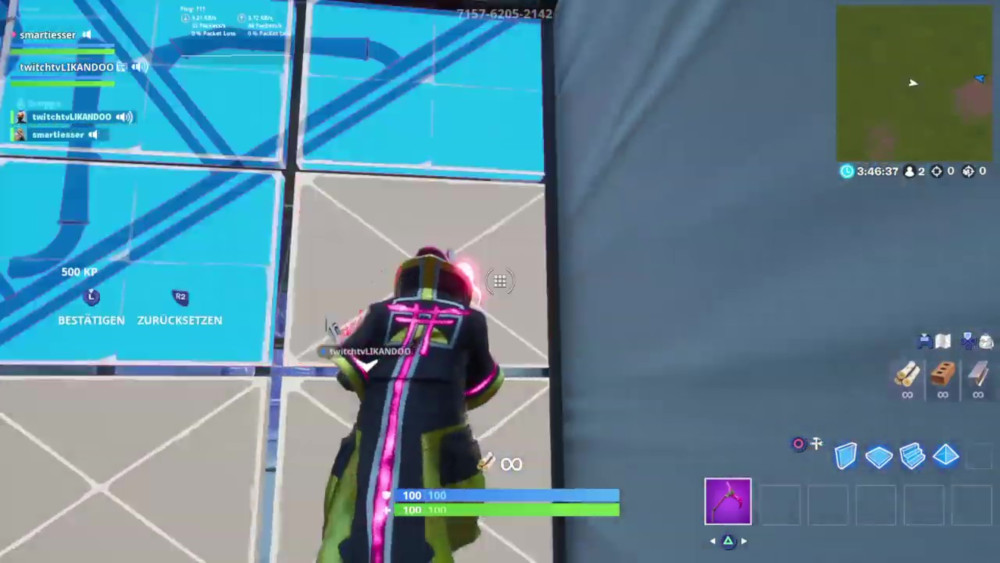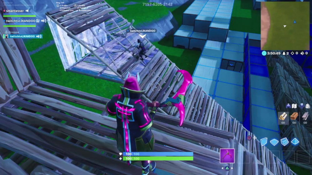 Nachdem mich der 30-Jährige zum vereinbarten Zeitpunkt in seine Lobby eingeladen hat, geht es auch direkt los mit unserem Fortnite Coaching und er nimmt mich mit auf eine eigens dafür erstellte Trainingskarte. Hier möchte der Streamer und Fortnite-Coach erstmal sehen, wie ich baue. Ja, bauen – nicht schießen. In Fortnite ist das Bauen nämlich mindestens genauso wichtig wie das Schießen. Das weiß ich, da ich Fortnite durchaus eine ganze Weile gespielt habe und der Meinung war, die Basics des Spiels zu beherrschen. Zwar stimmte das auch – auf die Frage, weshalb ich trotzdem kein sonderlich guter Spieler bin, kann mir likandoo später allerdings noch eine ziemlich schlüssige Antwort geben.