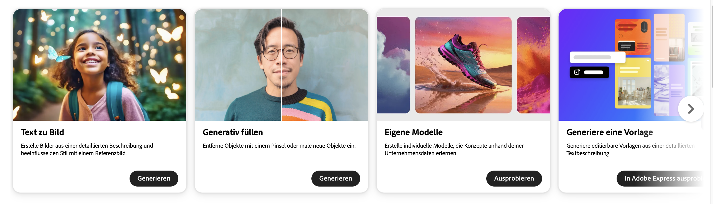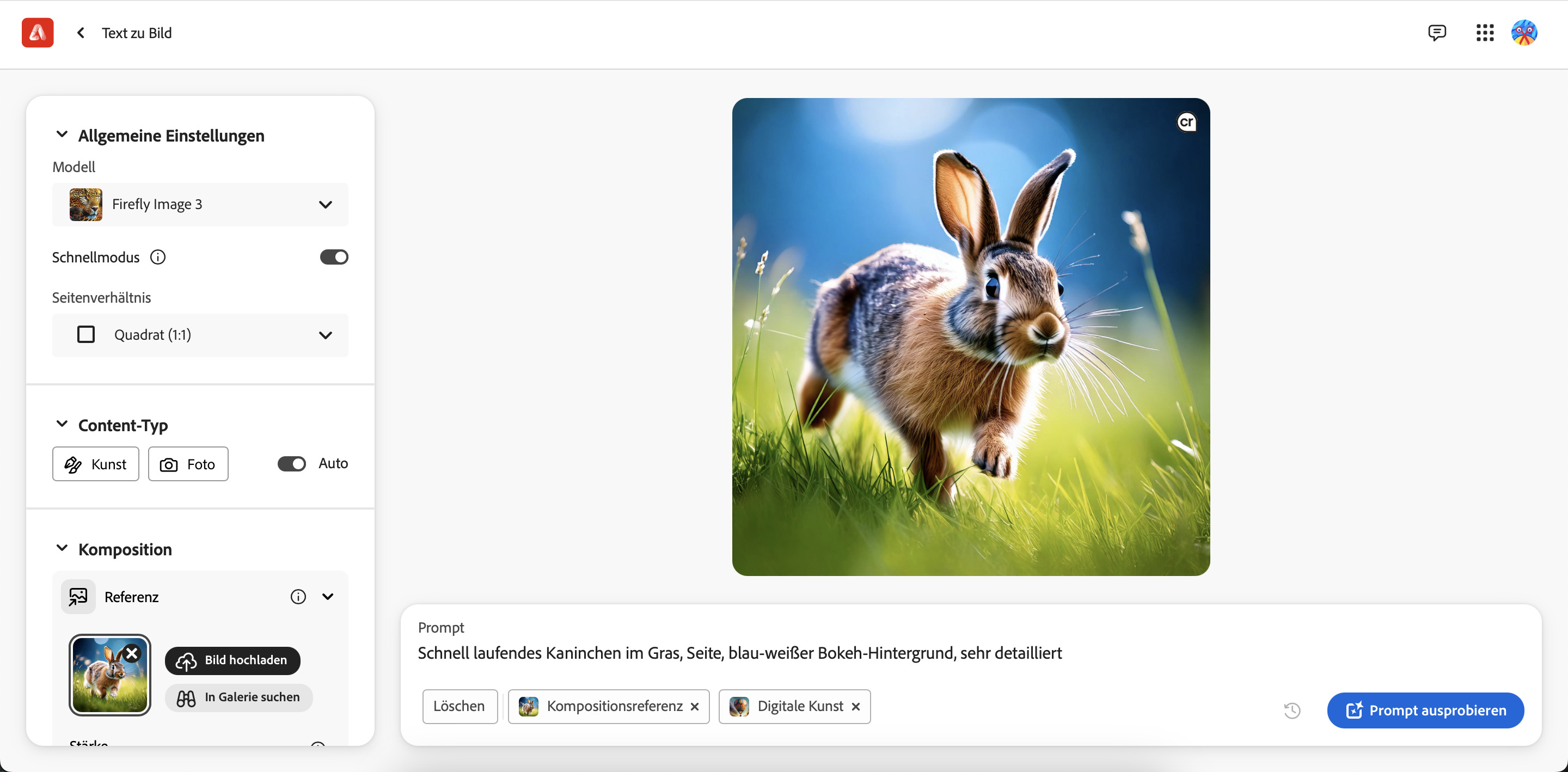 Texte-zu-Bild: Mit dieser Funktion könnt ihr Bilder generieren, die auf einer kurzen Beschreibung basieren. Gebt z. B. „Ein ruhiger Wald im Morgennebel“ ein, und Firefly erstellt eine passende Szene. Diese Funktion ist ideal, wenn ihr Inspiration sucht oder schnell visuelle Inhalte für Projekte wie Social-Media-Posts oder Illustrationen benötigt