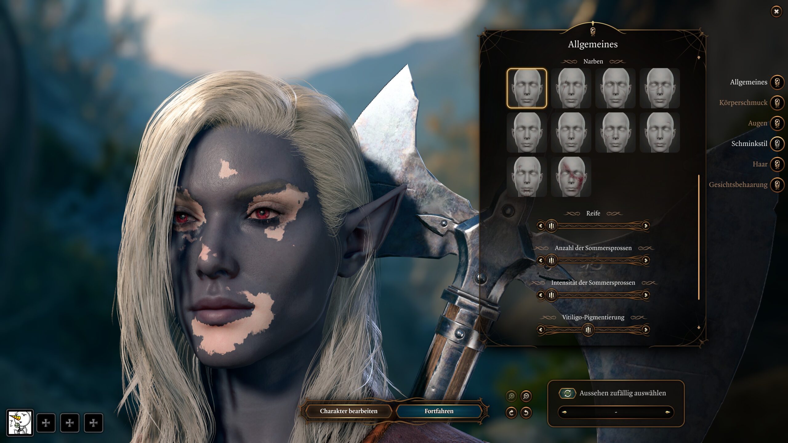 Detailierte Slider um jedes Polygon im Gesicht anzupassen, dürft ihr in Baldur’s Gate 3 jedoch nicht erwarten. Stattdessen müssen wir mit einer Hand voll vorgefertigter Gesichter leben. Ich kann die Intention dahinter zumindest verstehen: Je größer die Einstellungsmöglichkeiten, desto schwieriger auch, ein passables Gesicht hinzubekommen. Dafür gibt es dann allerdings noch Slider für Alterung Sommersprossen und – das habe ich in noch keinem Spiel gesehen – Vitiligo-Pigmentierung. Auch verschiedenfarbige Augen und eine Identität unabhängig des Körperbaus erlauben sehr inklusive Charaktere. Besonders gelungen ist die Erstellung der Drachengeborenen, die viele volksspezifische Anpassungen des Aussehens bieten.