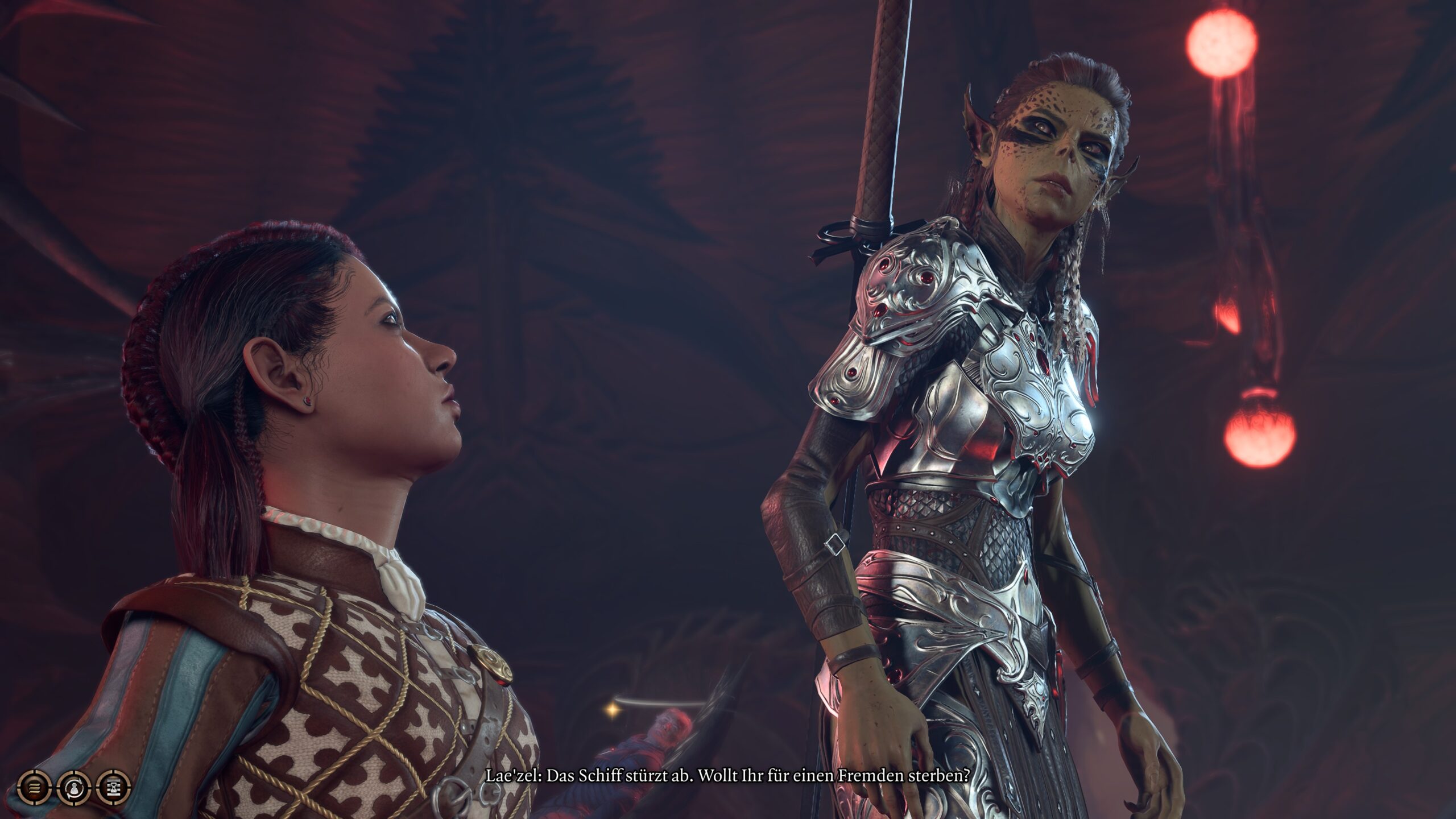 Am bodenständigsten wirkt dabei ausgerechnet die „außerirdische“ Githyanki Lae’zel. Ihre stets herablassende Art ist wohl zum Teil durch die völlig andere Kultur bedingt, zum anderen aber auch ein Selbstschutz, sich in dieser ihr unbekannten Welt zu behaupten. Ein Jammer dass ich sie später für eine andere Kriegerin auf die Bank setzen musste. Später im Rahmen ihrer Begleiterquest habe ich sie aber mit Freude wieder in die Gruppe aufgenommen.