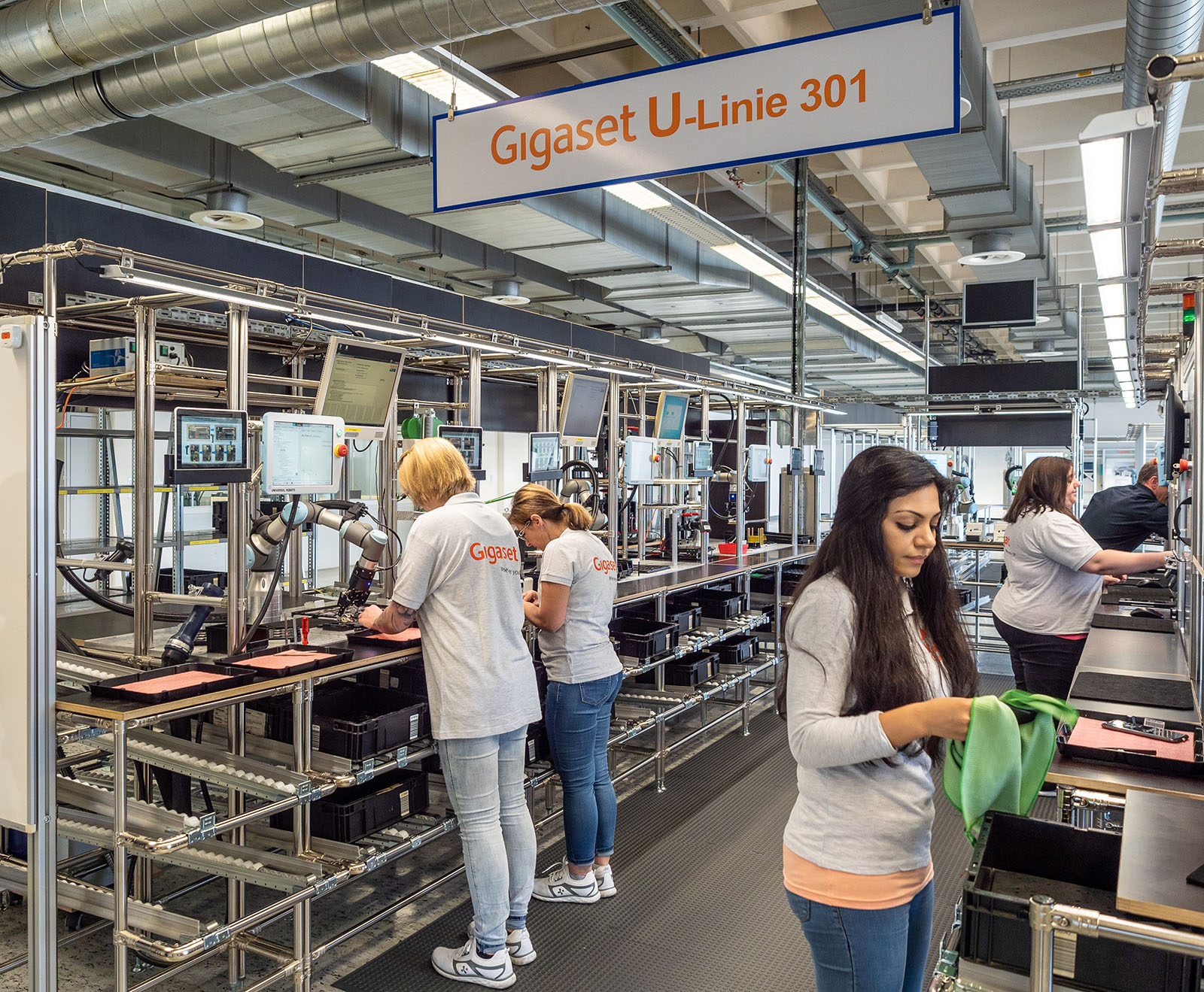 An der Fertigungsstrecke des Gigaset GS185 selbst sind acht Männer und Frauen tätig. Zudem verschafft die Smartphone-Produktion 30 weiteren Menschen in der Produktionstechnik, im Produktdesign, Vertrieb und Kundenservice Aufgaben. Das ist die Größenordnung für menschliche Beschäftigung, für die in einer stark automatisierten Produktion hierzulande noch Bedarf ist.