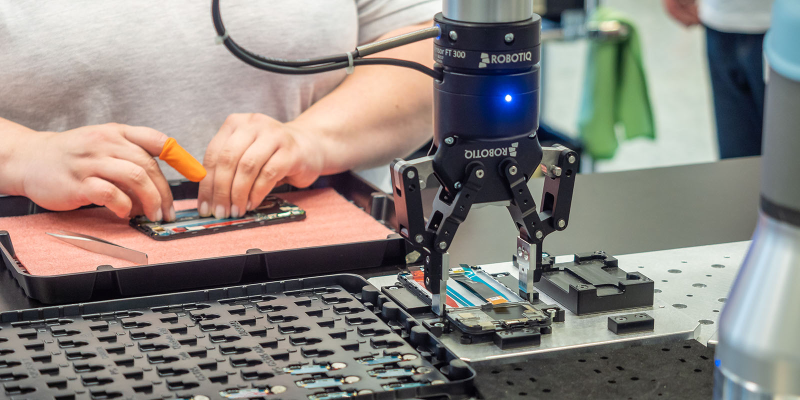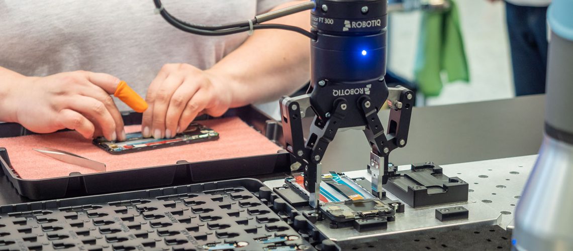 Im Zusammenspiel erledigen Roboter stark standardisierte und sich wiederholende Tätigkeiten, die menschliche Mitarbeiter ermüden und langweilen würden. Stattdessen kümmern sich die Beschäftigten um komplexere Aufgaben. So greifen Roboterarme die Bauteile vom Vorratsstapel und halten sie in Position, damit die Beschäftigten sie montieren können. Auch die mechanische Qualitätskontrolle der Tasten und des Touch-Displays nimmt Kollege Roboter vor. Ein anderer Fall ist es, wenn die Schutzfolie vom Display zu entfernen oder Kabel in der Gehäuseschale zu montieren sind. Damit kommen menschliche Hände besser klar.