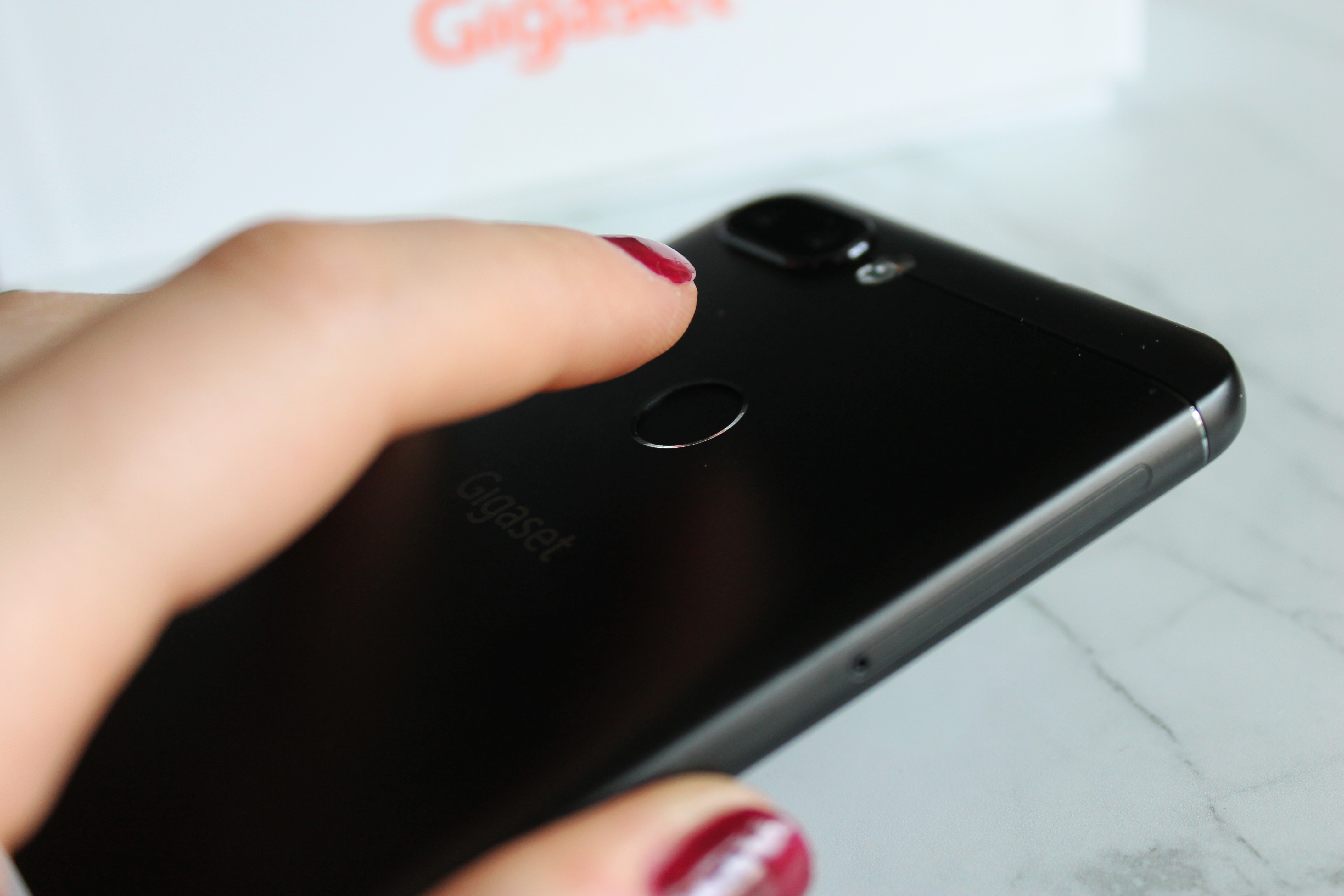 Gehen wir nun einen Schritt zurück und sehen uns das Gigaset Flaggschiff von außen an: In der Hand macht das Gigaset GS370 plus eine gute Figur. Das Aluminium-Gehäuse fühlt sich angenehm an und das Gewicht des GS370 plus vermittelt einen stabilen Halt. Der An- und Ausschalter sowie die Lautstärke-Tasten befinden sich auf der rechten Seite und sind so mit dem Daumen praktisch zu bedienen. Der Fingerabdruck-Sensor ist ergonomisch gut platziert und erkennt den Abdruck eures Fingers mit einer gewissen Zuverlässigkeit. Mir ist jedoch aufgefallen, dass ich, sobald ich das Smartphone in meiner Jackentasche bei mir getragen habe, häufig „zu viele Fehlversuche“ angezeigt bekommen habe. Dabei wollte ich in diesen Momenten das Gigaset GS370 plus nicht entsperren.