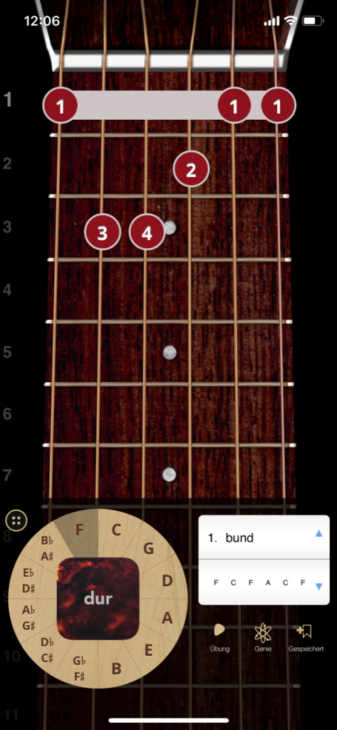 Um mit der App das Gitarre Lernen online wirklich ausschöpfen zu können, müsst ihr ein Abo mit allen zusätzlichen Funktionen für 15 Euro im Jahr abschließen. Außerdem kann man verschiedene Hintergrund-Musikstücke auswählen, die man dann bespielen kann. Die App bietet beim Tippen auf „Dur“ auch noch viele verschiedene Variationen von Akkorden an. Ein kleines Manko ist, dass Akkorde meiner Meinung nach eine eher unübersichtliche App ist. Sie eignet sich zwar grundsätzlich für den Gitarrenunterricht online, wie groß hier aber die Langzeitmotivation ist, ist schwer zu sagen.