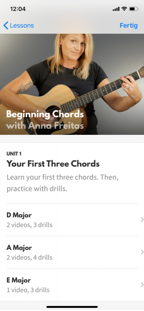 Diese App hat einen eher einfachen Namen und auch eine einfache Prämisse. Die kostenlose Version fungiert für erfahrene Gitarrenspieler wohl eher als Bibliothek, damit man sich einfach und übersichtlich alle wichtigen Griffe ins Gedächtnis rufen kann. Der wahre Lern-Faktor der App verbirgt sich in den vielen, kostenpflichtigen Kursen, die mit einem Premium-Account einsehbar sind. Dort gibt es dann Gitarrenkurse für Einsteiger, Fortgeschrittene, Experten und so weiter. Ihr könnt euch Tutorials zu verschiedenen Akkorden ansehen und auch etwas abseits der Griffe viel über Musiktheorie und Ähnliches lernen.