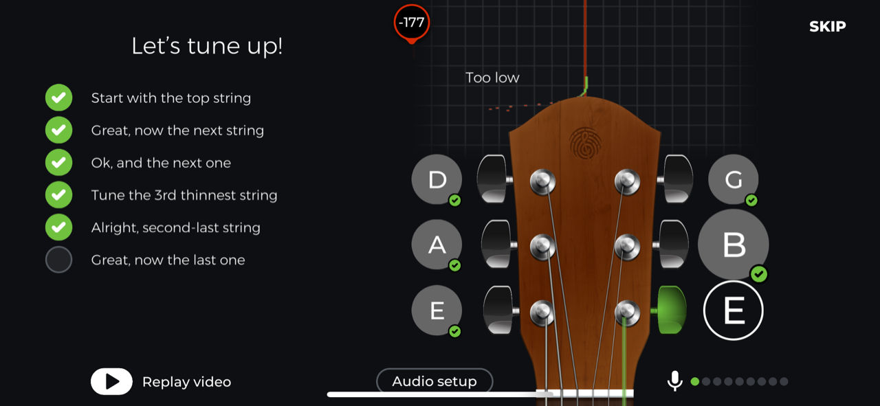 Wenn ihr euch die App herunterladet und sie testen wollt, könnt ihr sieben Tage lang kostenlos alle Funktionen nutzen. Das habe ich auch getan. Und ich muss ehrlich sagen, dass ich ab der ersten Sekunde begeistert war. Euch empfängt ein Sprecher, der quasi als euer virtueller Lehrer herhalten wird. Er erklärt euch zunächst, wie ihr eure Gitarre stimmen müsst und dann geht es auch schon los.
