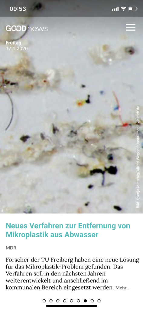 Die Good News App kann kostenlos für Android und iOS heruntergeladen werden. Sie versorgt euch täglich mit positiven News aus aller Welt. Dabei sucht das Team hinter der App täglich neue gute Nachrichten aus den deutschen Print- und Online-Medien. Besonderer Fokus liegt dabei auf Themen wie Nachhaltigkeit, soziale Gerechtigkeit und positiven Impulsen für das eigene Leben. Auch positive Nachrichten aus dem öffentlichen Leben sind mit dabei.