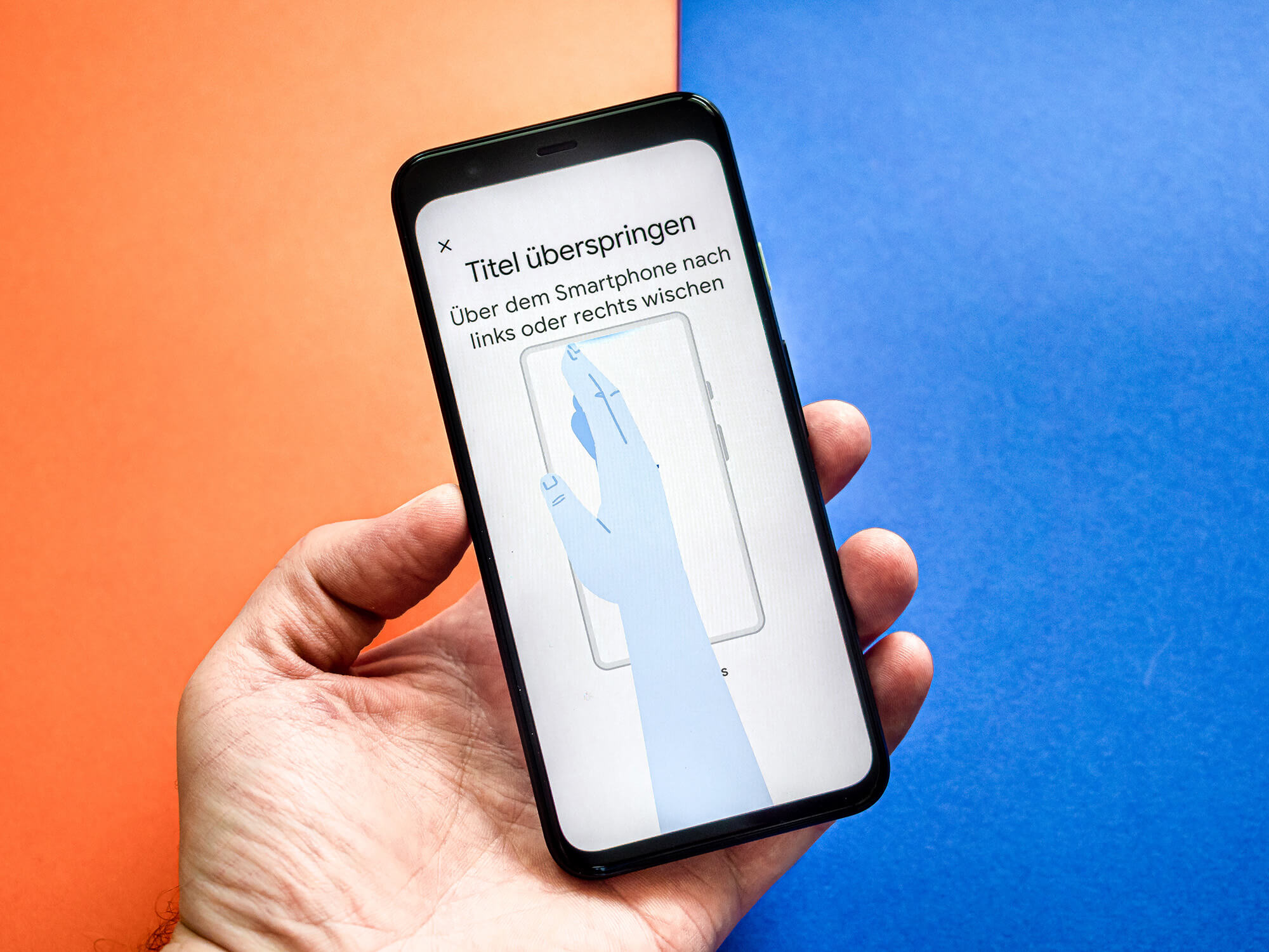 Handbewegungen erkennt ein Radar-Chip auf der Vorderseite des Geräts. Dafür hat Google diesen ungewöhnlich breiten Rand an der oberen Kante reserviert. Wenn ich in der Luft über dem Google Pixel 4 im Test von rechts nach links wische, aktivere ich in einer Musik-App das nächste Lied, umgekehrt das vorherige Lied. Klingelt das Telefon oder der Wecker, kann ich das Smartphone mit einem Wisch in eine beliebige Richtung stumm schalten.