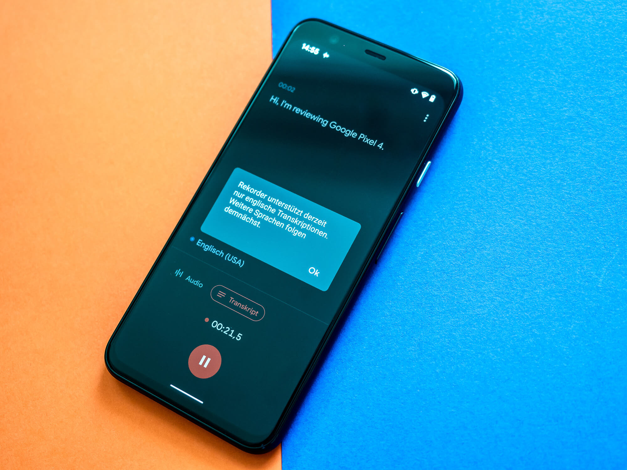Das klappt mit dem Google Pixel 4 im Test ziemlich gut, allerdings bisher nur auf Englisch. Zum Einsatz kommt dafür die interne Spracherkennung. Daher muss das Gerät nichts in die Cloud funken. Das verbessert die Privatsphäre, erfordert aber eben auch, dass Google eine Offline-Sprachdatei bereitstellt.