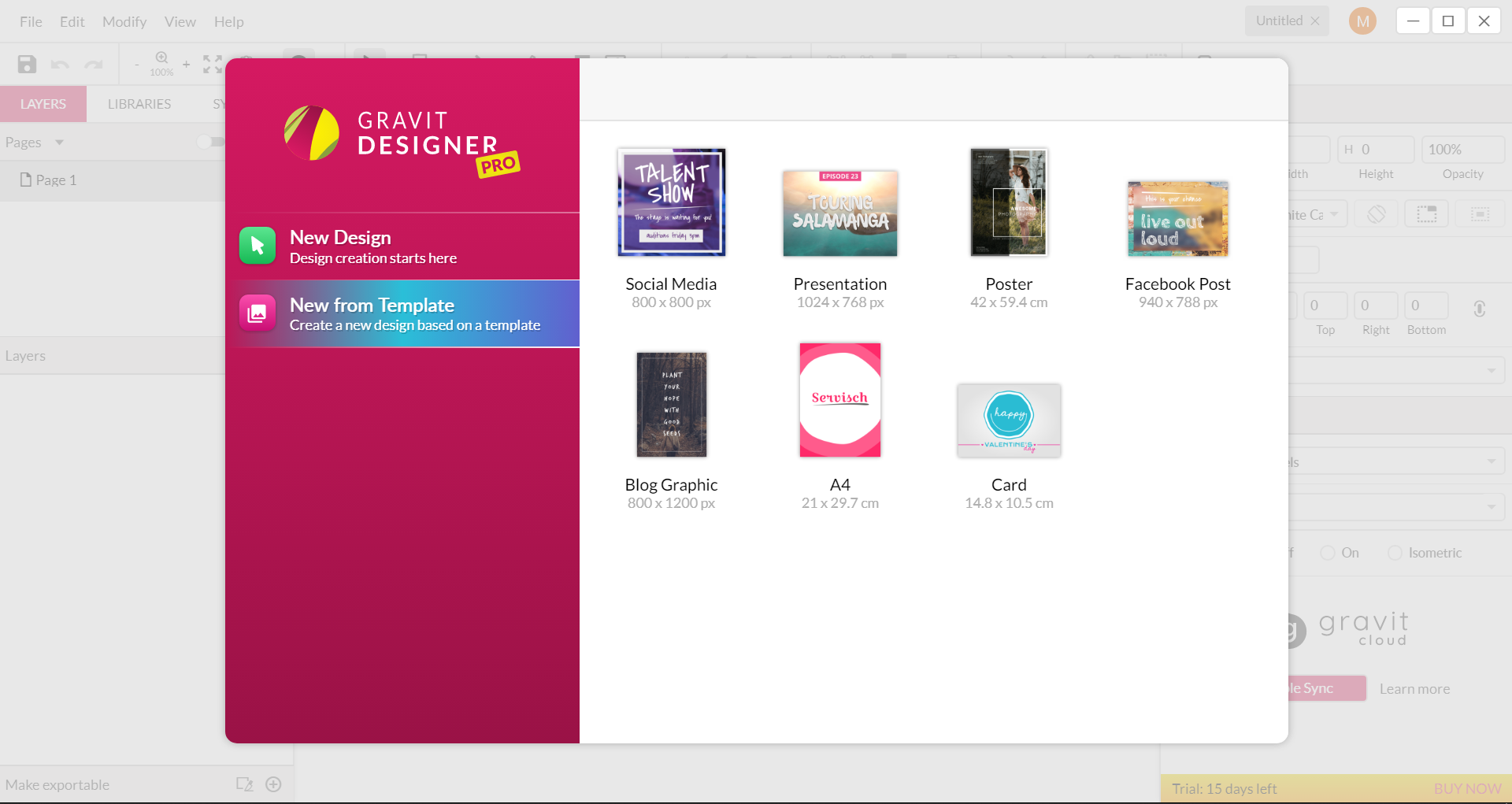 Gravit Designer ist besonders praktisch, wenn es darum geht grafisch ansprechende Posts zu erstellen. Hier können wir aus einer ganzen Reihe von Templates auswählen, die uns verschiedene Stile vorgeben. Diese lassen sich nach Lust und Laune zum Beispiel dem Branding der eigenen Website oder des YouTube-Kanals anpassen. Wer hier mit Icons oder Illustrationen arbeiten will, kann diese zwar selber erstellen, Gravit Designer verfügt allerdings auch über eine ganze Reihe von fertigen Symbolen und Illustrationen, die sich in das eigene Design einfügen lassen. Diese können laut Gravit Designer sowohl für private, als auch kommerzielle Zwecke genutzt werden.