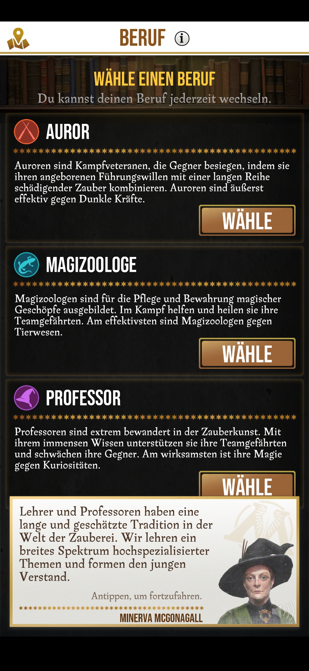 Mit Stufe sechs können wir uns außerdem für einen Beruf entscheiden. Wir können Auror, Magiezoologe oder Professor werden. Der Auror ist eher offensiv ausgerichtet, der Magiezoologe defensiv und der Professor sehr ausgeglichen. Seid ihr in einer Gruppe unterwegs, sollte diese am besten gut gemischt sein, da jeder Beruf seine eigenen Stärken gegen bestimmte Gegner hat.