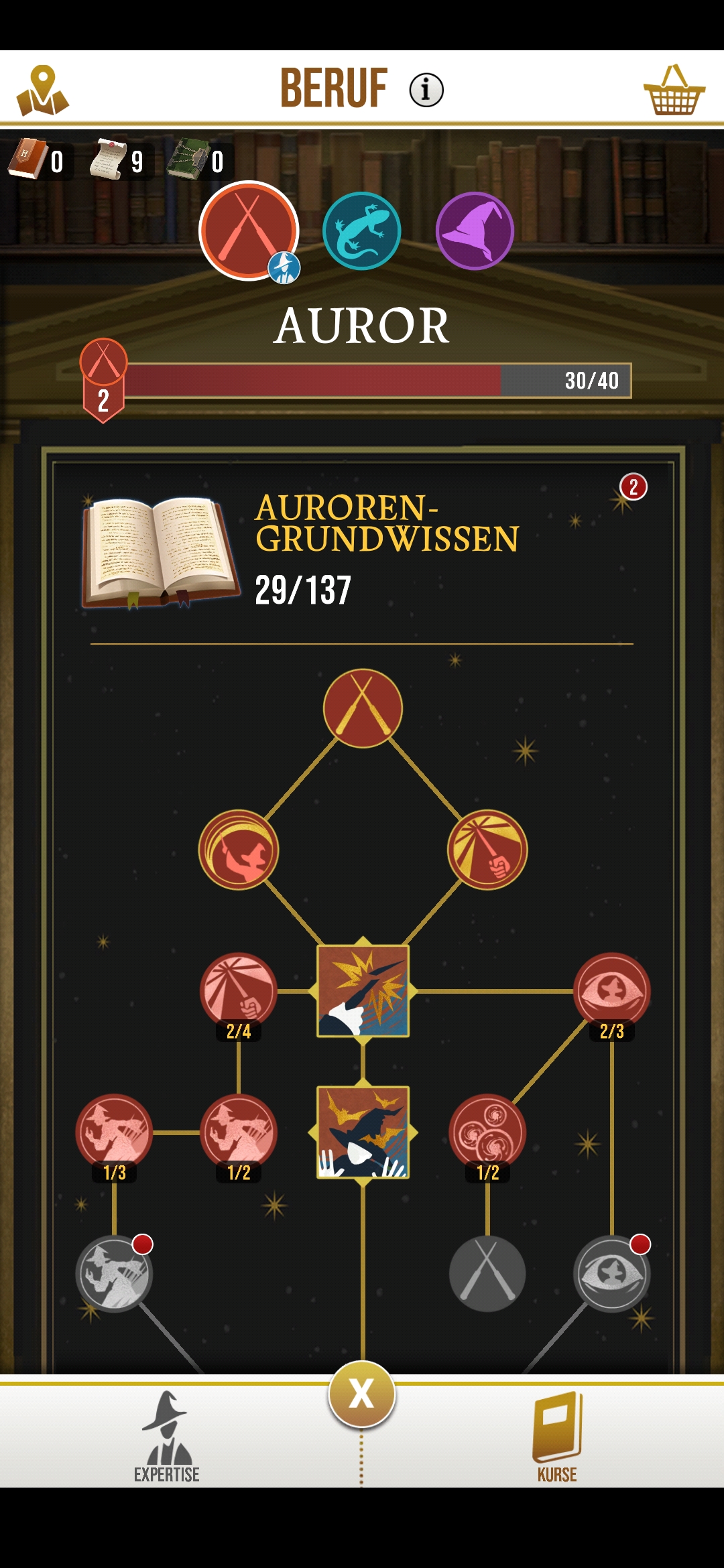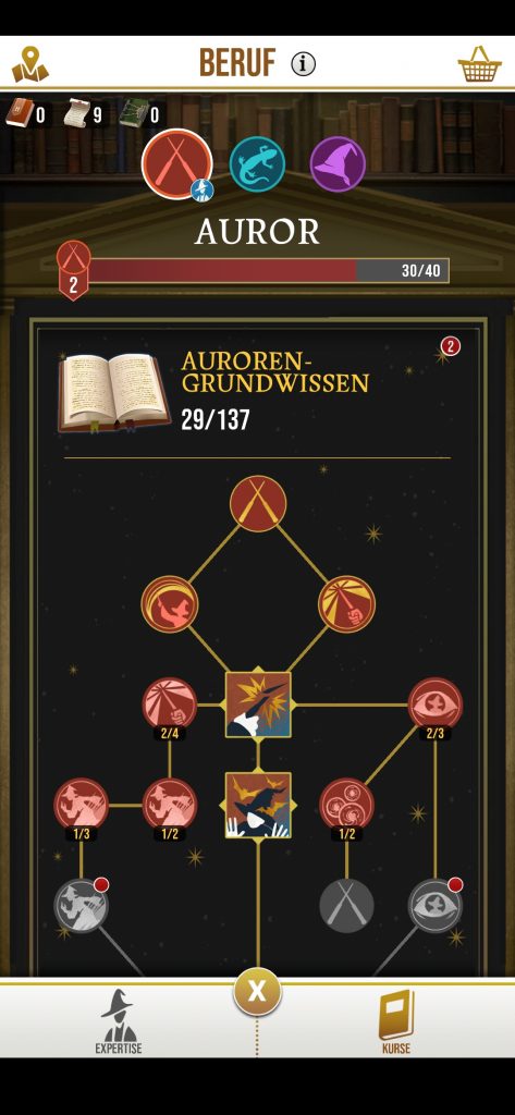 Als „Kurse“ bezeichnen sich die Fähigkeitsbäume der Berufe, in denen wir neue Zauber oder Boni auf bestimmte Werte bekommen. Durch gesammelte Schriftrollen und Zauberbücher können wir diese Kurse aktivieren. Den Beruf können wir jederzeit wechseln, erhalten aber nicht unsere investierten Schriftrollen oder Bücher zurück.