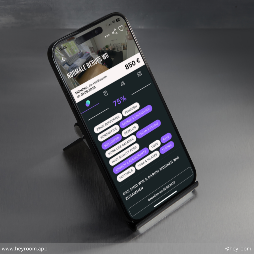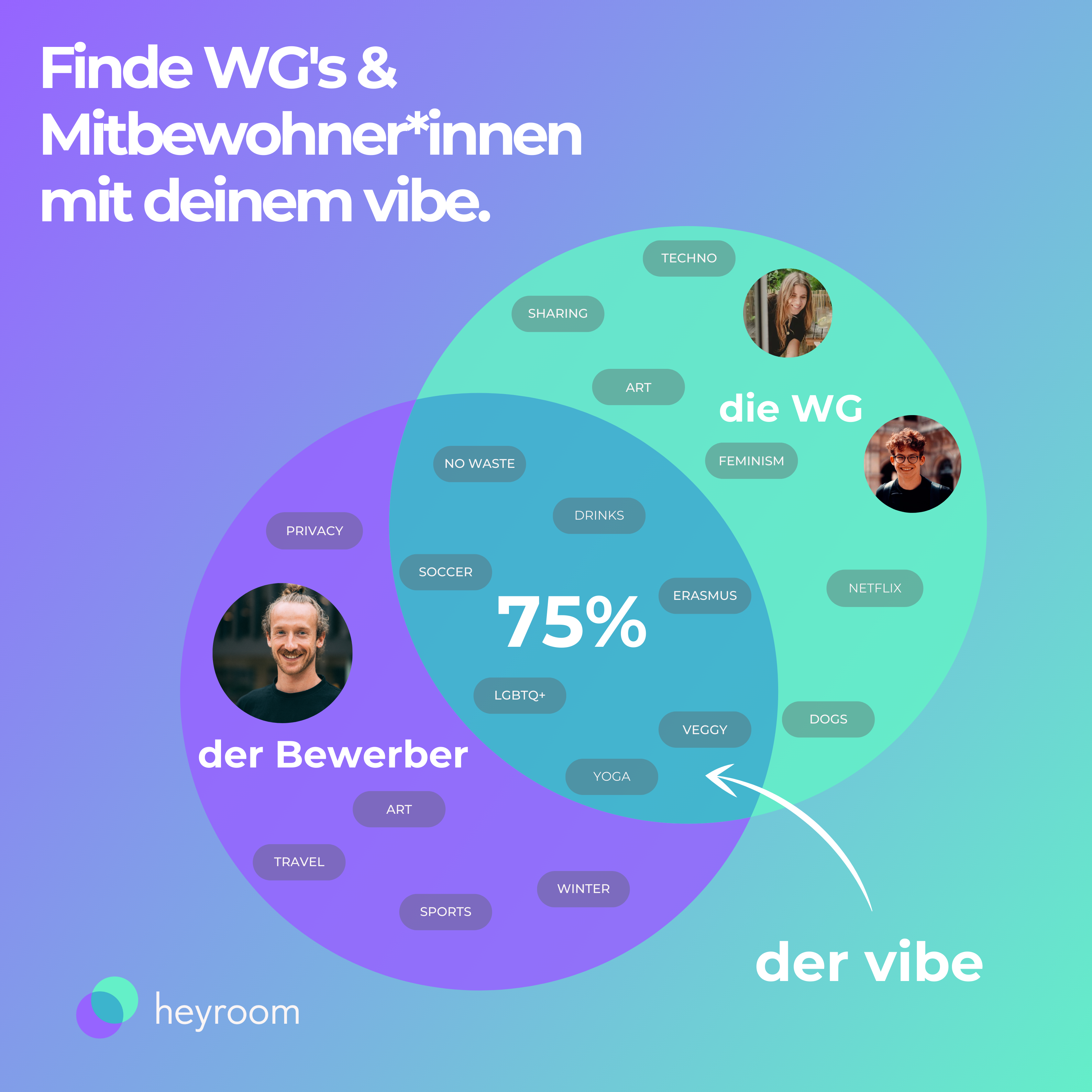 (lacht) Ok, alles klar. Also heyroom funktioniert so, dass wenn man ein WG-Zimmer einstellt oder sucht, man neben den ganzen Hard-Facts auch Soft-Facts hinterlegen muss. Das sind ca 15 Interessen und Wertvorstellungen. Das heißt, dass jede WG angibt, was ihnen am WG-Leben wichtig ist. Das kann sowas wie LGBTQ+ oder umweltfreundlich sein, aber auch Hobbies wie z.B. Tischtennis. Der große Vorteil ist, dass jede bzw. jeder BewerberIn das auch tun musste. Sobald das Zimmer online ist, sieht man dann anhand des Vibe-Scores, der sich durch die Überschneidungen errechnet, mit wem man die meisten Interessen bzw. Werte teilt. Damit überspringt man den Prozess des langen Nachrichtenlesens- und schreibens.