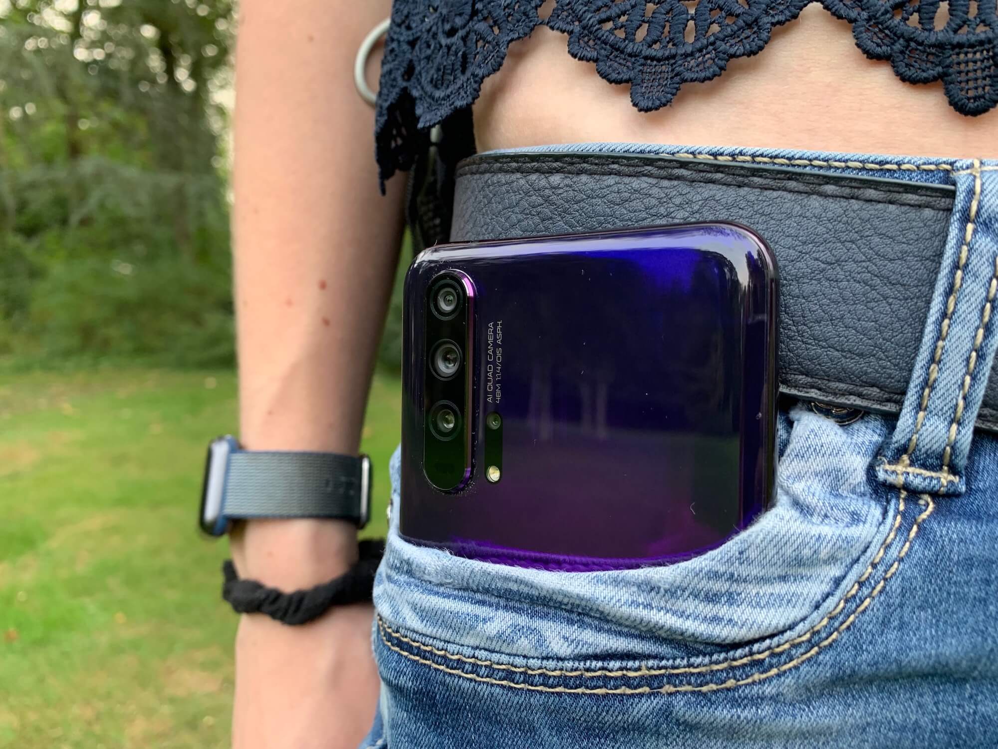 Wie man es von einem Flagship-Smartphone erwartet, ist das Gerät einwandfrei verarbeitet. Dank des 2,5D-Glases auf der Vorderseite und der etwas mehr gewölbten Rückseite liegt das Telefon angenehm in der Hand. Sehr schön: das Display selber ist nicht gewölbt, wodurch es zu keinen Fehleingaben am Rand kommt. Die Glasrückseite ist in Blau-Grün und Schwarz-Lila erhältlich. Je nach Licht schimmern die Farben unterschiedlich intensiv, was die Smartphones zu einem echten Hingucker macht. Das normale Honor 20 kommt hingegen in einfachem Schwarz oder Blau. Durch die Spiegelungen und die dunkler gehaltenen Farbtöne fallen Fingerabdrücke etwas weniger auf, als auf spiegelglatten Geräten. Dennoch zieht die Glasrückseite diese an.
