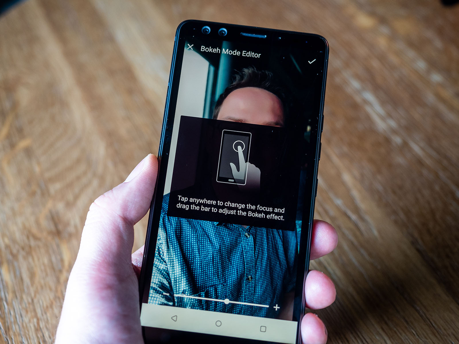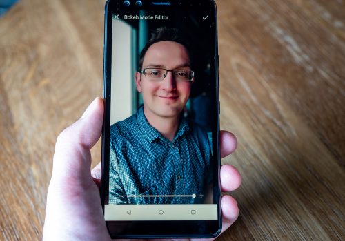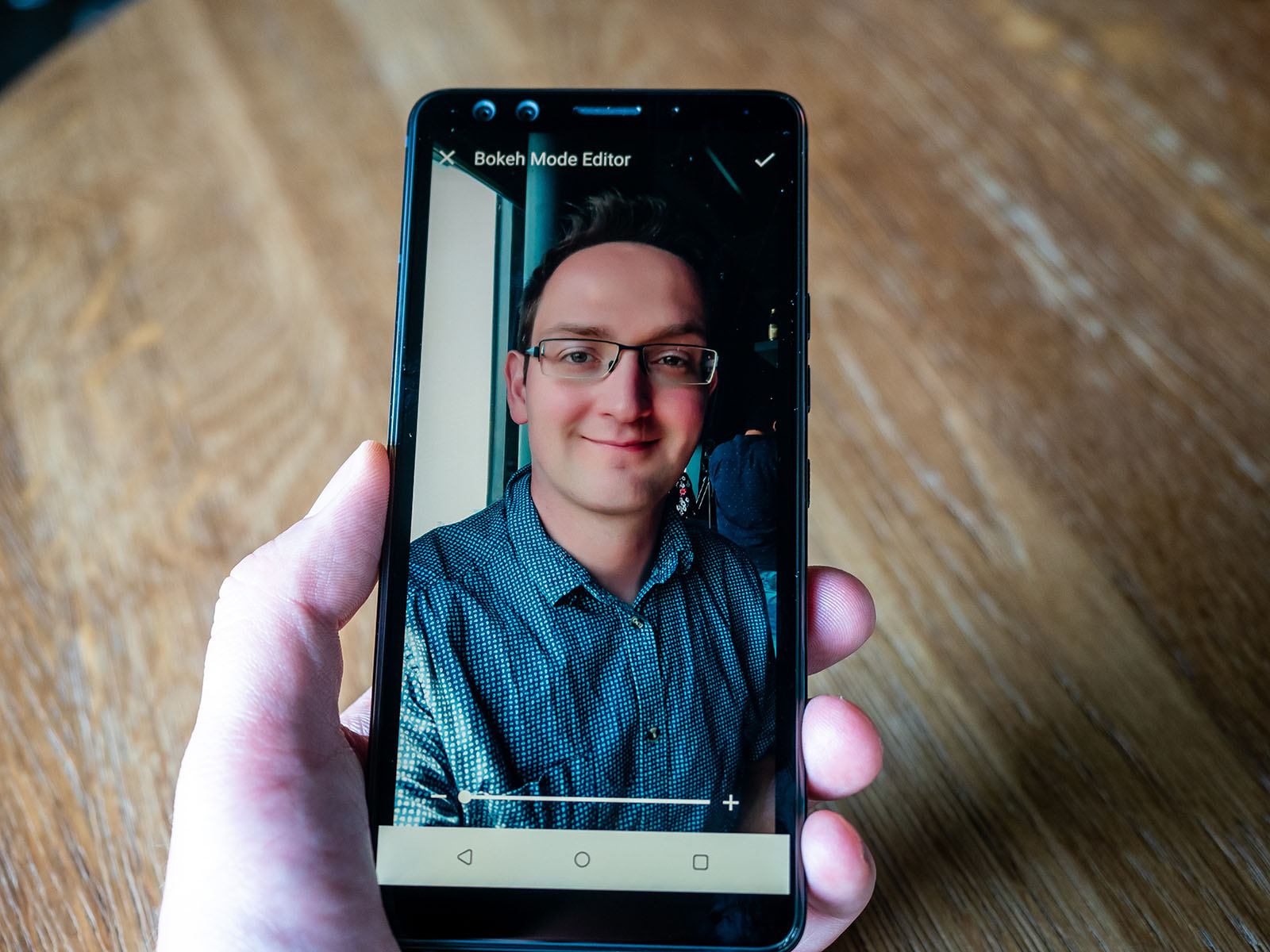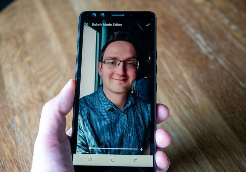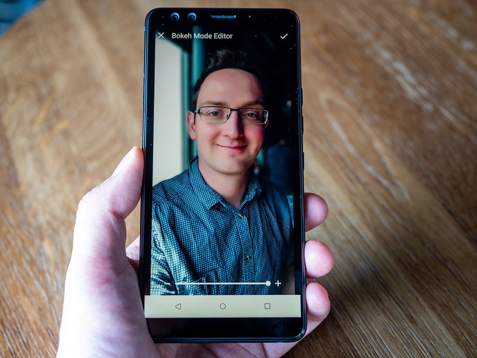 Beide Kamera-Duos verrechnen Tiefeninformationen, um für einen simulierten Bokeh-Effekt zwischen Vorder- und Hintergrund unterscheiden zu können. Zudem sollen die 3D-Infos der Frontkameras die Gesichtserkennung beim Entsperren des Displays („Face Unlock“) weniger anfällig für Tricks machen. Der Bokeh-Effekt der vorderseitigen Dual-Kamera wirkte im Selbsttest sehr ordentlich. Praktisch: Die Hintergrundunschärfe ließ sich dank eines Schiebereglers innerhalb der nativen Kamera-App variieren.