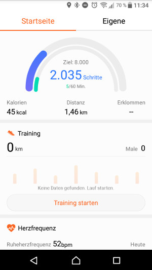 Die eigentliche Überwachung findet auf der zweiten App “Huawei Health” statt. Hier werden alle Daten genauestens aufgezeigt und analysiert. Die App zeigt, ob ich mein Tagesziel geschafft habe, oder wie weit ich davon noch entfernt bin. Auch meine zurückgelegten Schritte am Tag werden hier aufgezeichnet, sowie die Distanz und die verbrannten Kalorien.
