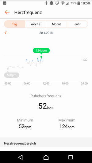Wer aktiv joggt, der kann sich sein Training ebenfalls in dieser App anzeigen lassen und auch gleich seine Herzfrequenz überprüfen. Hierbei sieht man im Menü “Details” die einzelnen Werte und im welchem Bereich man sich aufgehalten hat. Auf meinem Beispiel kann man erkennen, dass ich es bis in den grünen Bereich geschafft habe, was so viel heißt, dass ich Fett verbrannt habe. Die einzelnen Farben stehen für verschiedene Stufen, was sinnvoll ist, um sich beim Sport selbst überprüfen zu können und zu sehen, wie effektiv die Sporteinheit war.