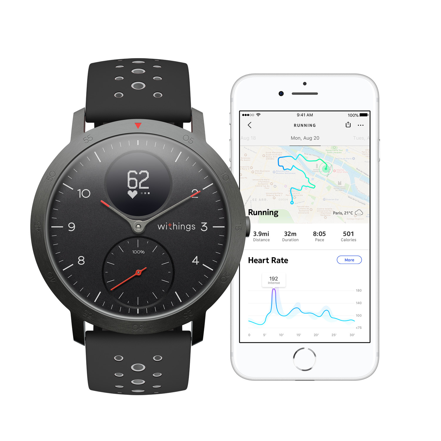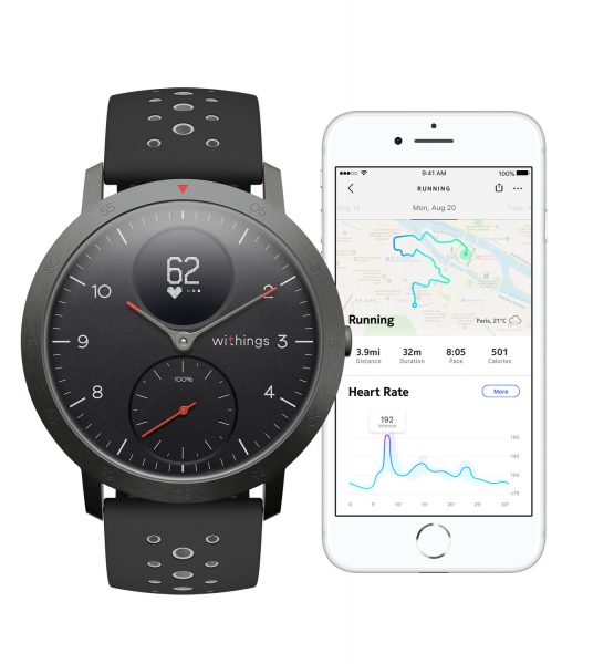 Das analoge Ziffernblatt zeigt nicht nur die Uhrzeit an, sondern auch den prozentualen Teil des täglichen Schrittzieles. Auf dem dezenten OLED-Display werden die wichtigsten Gesundheits- und Sportdaten wie tägliche Schritte, Kalorien, die gelaufene Distanz und die Herzfrequenz angezeigt. Mit dem Multisport-Tracking kann für über 30 verschiedene Aktivitäten von Yoga und Volleyball über Rudern bis hin zu Boxen, Skifahren und Eishockey die Herzfrequenz und die Dauer des Trainings dokumentiert werden. Für Läufer hat sich Withings zudem einige besondere Features ausgedacht. Mit der Steel HR Sport kann der Nutzer Geschwindigkeit, Entfernung und Höhenmeter der zurückgelegten Strecke nachvollziehen. Außerdem kann auf einer Karte die gelaufene Strecke eingesehen werden. Diese Funktion kann auch beim Spazieren oder Radfahren genutzt werden.
