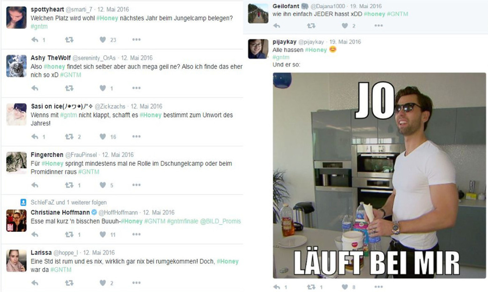 Großer Spaß unter den Zuschauern und vor allem Twitter-Nutzern entsteht so vor allem um das „Haten“ gewisser Teilnehmer. Bestes Beispiel ist der sogenannte „Honey“, einer der Kandidaten des aktuellen Camps. Alexander Keen, so der volle Name des Male-Models, erlangte zuerst „Prominenz“ durch einen Gast-Auftritt in „Germany’s Next Topmodel“ als Freund einer Kandidatin, ein Format, bei dem die Grenzen zwischen Inszenierung und Authentizität auch immer mehr zu verwischen erscheinen. Auf Twitter mauserte sich der eigentliche Nebencharakter in der Model-Saga bald zum Publikums-Liebling beziehungsweise eher Anti-Liebling. Woche für Woche explodierte der Hashtag #Honey auf Twitter und Nutzer verfielen in einen wahren Hate-Rausch. Sogar ProSieben griff dies auf und passte die Promos für die aktuellen Folgen auf das Phänomen „Honey“ an.