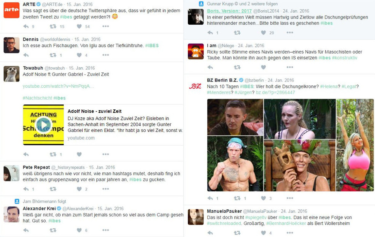 Wodurch entsteht der Unterhaltungsfaktor beim Dschungelcamp? Sind es die Prüfungen, der Ekel, der Klatsch und das (manchmal auch nicht) inszenierte zwischenmenschliche Drama der Kandidaten? Oder fiebern wir einfach gern mit ihnen mit? Vor allem die Begleitung der Sendung durch Twitter macht für viele einen großen Spaßfaktor beim Dschungelcamp aus. Während der zwei Wochen Sendezeit ist der Hashtag #ibes mit ziemlicher Sicherheit wieder häufiger in den Twitter-Trends. Die Nutzer fiebern mit, kommentieren und inszenieren sich so auch selbst mit Witzchen, Bemerkungen und sarkastischen Kommentaren. Man kann es teilweise schon fast ‚Hate-Kultur‘ nennen.