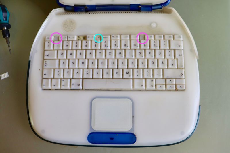 Genial einfach ist beim iBook G3 auch das Abnehmen der Tastatur gelöst. Es gibt lediglich zwei kleine Befestigungsriegel zwischen der F8- und der F9 sowie der Escape- und der Helligkeitstaste. Schiebt diese Riegel nach unten und hebt das Keyboard vorsichtig ab. Sollte das nicht funktionieren, dreht zusätzlich die Befestigungsschraube zwischen F4- und F5-Taste um eine halbe Umdrehung (180°), dann sollte es klappen.