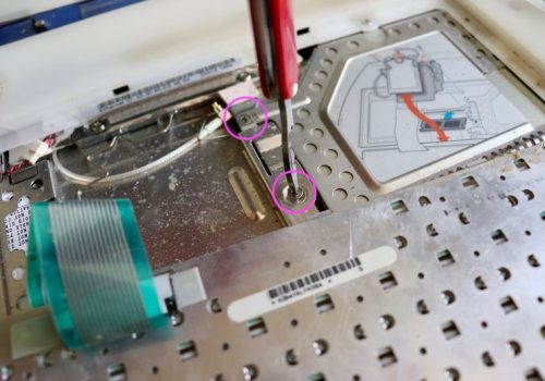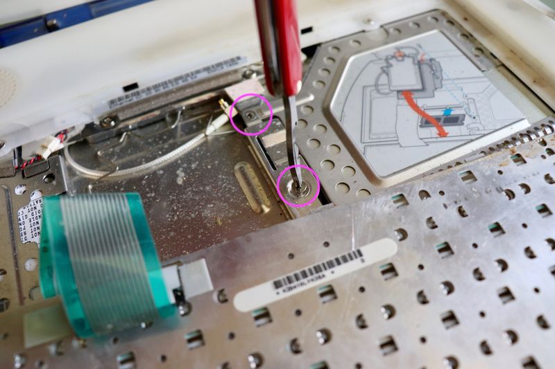 Um nun die Tastatur komplett zu entfernen, löst die beiden Schrauben am rechten Rand des Metallschutzes. Das sogenannte RAM-Shield verfügt über einen Metallbügel, den ihr nach oben klappen könnt, um jetzt das RAM-Shield daran heraus zu heben. Zum Schluß löst ihr das Tastaturkabel, indem ihr an der durchsichtigen Plastikschlaufe zieht.