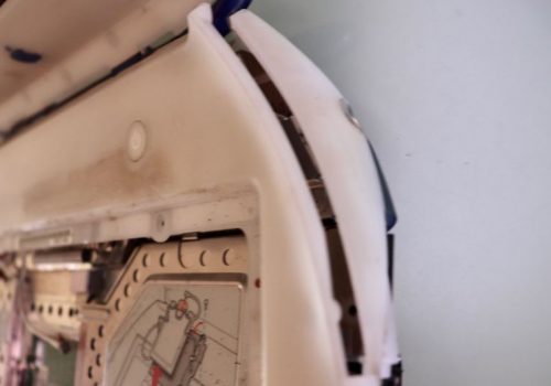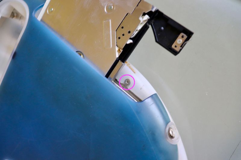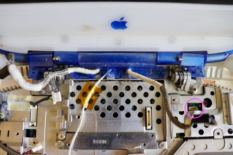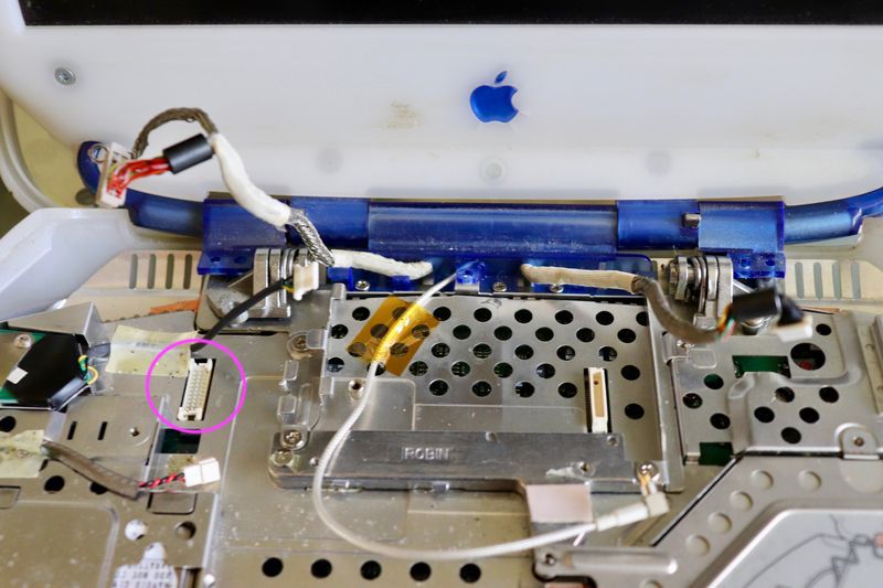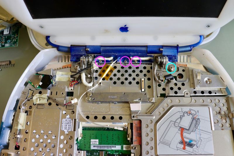 Entfernt die Schrauben am linken Gelenk des Deckels vom iBook G3 und löst das Airportkabel unter dem gelben Klebestreifen heraus. Trennt nun das große Bildschirmkabel auf der linken Seite vom Logicboard und löst es behutsam aus den Plastik und Metallhalterungen. Das gleiche macht ihr mit dem Beleuchtungskabel auf der rechten Seite.