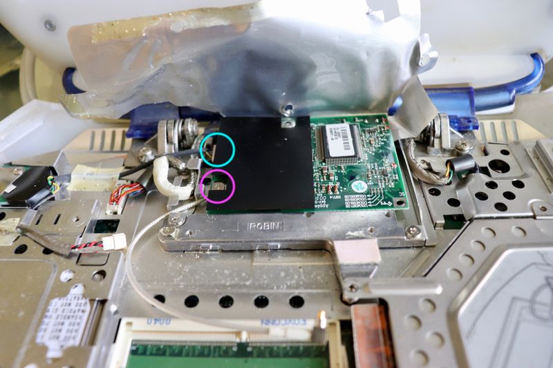 Anschließend hebt ihr die Airportkarte am Plastikstreifen nach vorne aus der Halterung und entfernt das Antennenkabel. Da unser iBook keine Airportkarte hat, konnte ich diese Schritte überspringen.