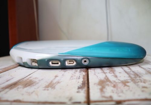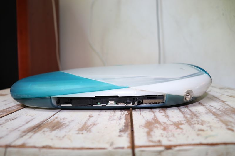 Gute 20 Jahre später liegt mein Vaio längst auf dem großen japanischen Elektroschottfriedhof. Hingegen lässt sich das alte iBook G3 meines Mannes vom Dachboden so problemlos in macOS 9.2 booten, als hätten wir es gestern zuletzt genutzt und danach ordnungsgemäß heruntergefahren. Das iBook zählt dank seiner robusten Technik und langlebigen Komponenten rückblickend zu den verlässlichsten Notebooks von Apple. Das gilt in weiten Teilen auch für unser Indigo-Modell (M6411) mit einem 366 Megahertz getakteten PowerPC-G3-Prozessor, 64 Megabyte Arbeitsspeicher und der zehn Gigabyte Festplatte– aber die Zeit hat doch auch ein paar tiefe Spuren an der blauen Puderdose hinterlassen.