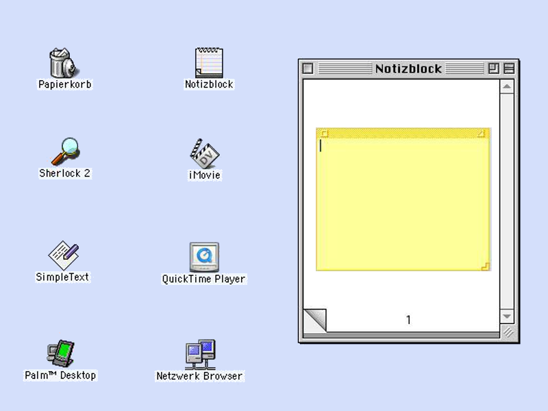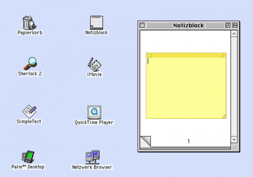 Auch unter MacOS 9.2, auf der Platinum-Oberfläche sieht also der Mülleimer aus wie eine mit Papier gefüllte Tonne. Ein Taschenrechner mit plastisch gestalteten Tasten oder das Icon der Suche als Lupe sollen die Interaktionen auf der grafischen Oberfläche so intuitiv wie möglich machen. Und so gleicht auch die Notizzettel einem Post-it – ich mag das.
