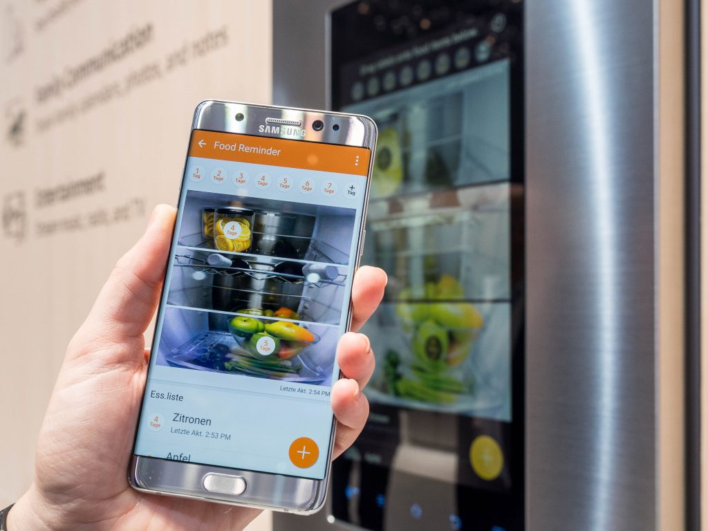 Samsung ist bei der Entwicklung eines smarten Kühlschranks am weitesten. Mit dem Family Hub RB7500 kommt das erste marktreife Modell jetzt in Deutschland in den Handel. Ab Oktober ist es erhältlich – für saftige 4.399 Euro. Es handelt sich um einen Kühler und Gefrierer im Standardformat. Auf den IMB, einer Vorab-IFA, hatte Samsung im Juli noch eine Doppeltür-Version (Side-by-Side) gezeigt. Sie ist aber nicht für den deutschen Markt gedacht. Damals konnte ich mich bereits ausführlich mit dem Family-Hub-Konzept von Samsung beschäftigen. An den Grundfunktionen hat sich nichts geändert. Ein paar Details sind hinzugekommen. Herzstück ist ein Computer mit 21,5 Zoll großem Touch-Display – der sogenannte Family Hub. Er ist in die Außentür eingelassen und läuft mit Samsungs Betriebssystem Tizen, das wie Android auf Linux basiert. Der Family Hub lässt sich per Wi-Fi anfunken. Die Kernfunktionen drehen sich rund um Lagerung und Einkaufen, wobei Online-Shopping mit dem Gerät selbst nicht funktioniert. Mit der Smart Home-App von Samsung kann man von unterwegs in den Kühlschrank schauen und prüfen, welche Lebensmittel vorhanden sind. Außerdem lassen sich mit dem Family Hub Einkaufslisten führen und mit dem Smartphone abgleichen. Auf dem Kühlschrankdisplay können virtuelle Verfallsmarken an den gelagerten Lebensmitteln befestigt werden. Sie aktualisieren sich als Countdown und warnen, wenn Schluss mit der Genießbarkeit ist. Am Samsung-Stand im CityCube konnte ich ein Galaxy S7 edge mit einem ausgestellten Kühlschrank verbinden und die Funktionen testen. Das funktionierte wunderbar.
