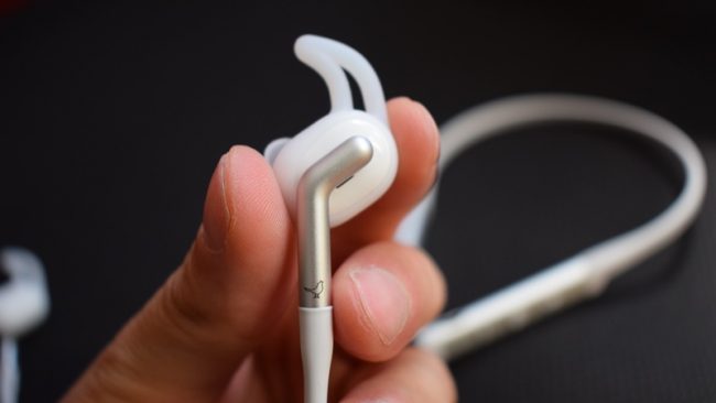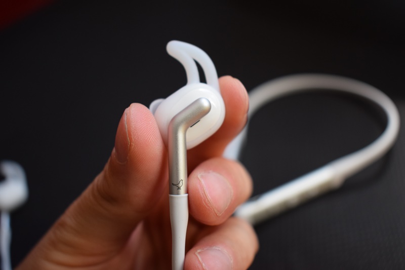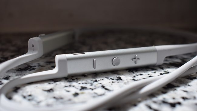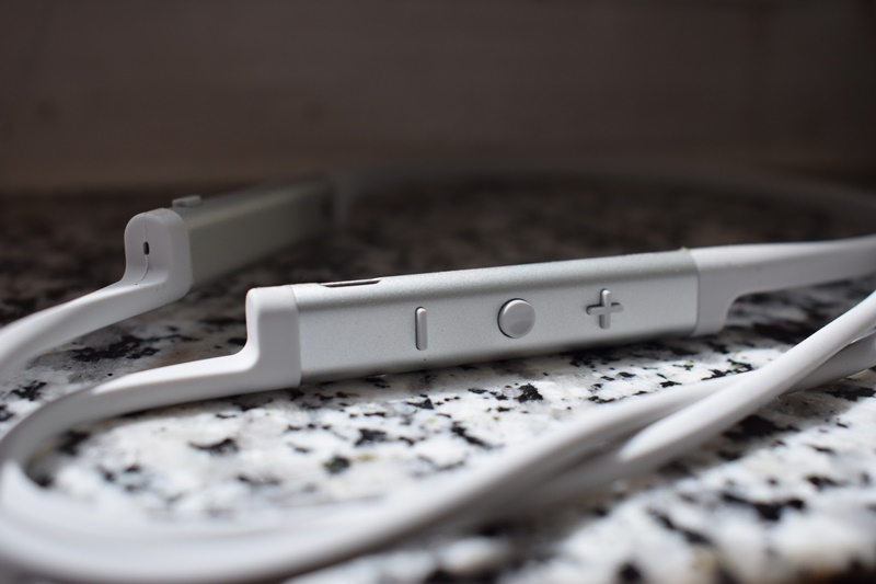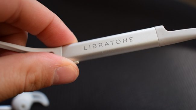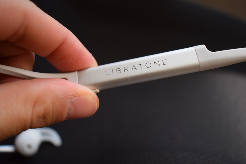 Die beiden In-Ear-Hörer sind durch einer stabilen, mit festerem Silikonüberzug beschichtete Kabelverbindung gekoppelt, die man sich lässig um den Nacken legt. Verrutschen tut hier nichts. An der linken und rechten Seite ist jeweils ein Steuerelement mit einem Alugehäuse angebracht. So sind die Libratone Track+ nicht nur unverknotbar, sondern auch leicht zu bedienen. Die beiden Steuerelemente sind etwa 5 Zentimeter lang und 0,5 Zentimeter breit. Durch ihre handliche Aufmachung während des Hörens sind sie gut zu erreichen.