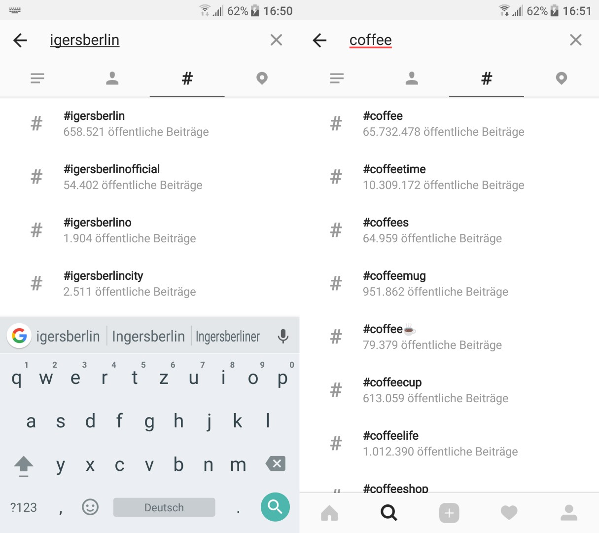 Welche Hashtags häufig genutzt werden, verrät dir Instagram selbst. Sobald du das Hashtag-Zeichen und ein paar Buchstaben eintippst, schlägt dir Instagram passende Stichwörter vor. Dabei solltest du Hashtags sowohl in deutscher als auch englischer Sprache nutzen.