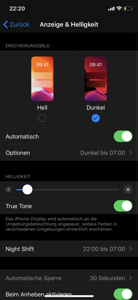 Die größte Neuerung, die sofort ins Auge sticht, ist natürlich der neue Dark Mode. Er kann in den Einstellungen entweder manuell eingestellt werden, oder ihr legt eine Zeit fest, in der der Dunkelmodus aktiviert sein soll. Das iPhone soll auch selbst erkennen können, ab wann die Sonne untergeht und sich dann dementsprechend selbst abdunkeln. Im Allgemeinen wirkt der Dunkelmodus wie eine Runde Sache. Das Interface sieht modern aus und ist gerade am Abend deutlich angenehmer zu bedienen. Auch die Hintergrundbilder sollen sich dem Dunkelmodus anpassen können.