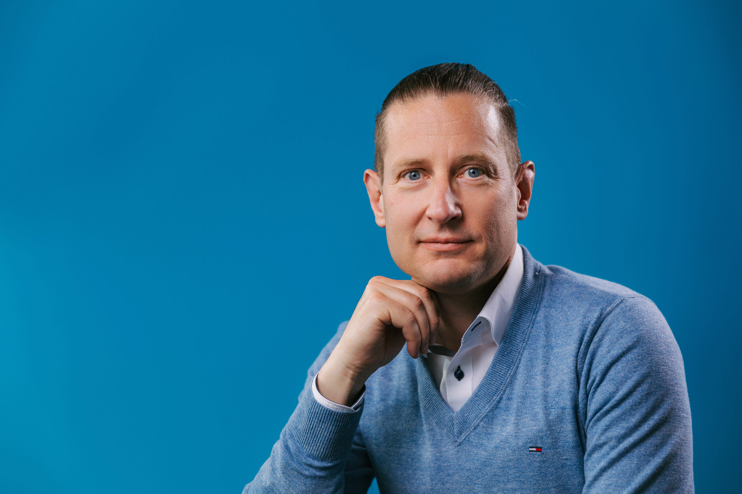 Autor Thomas Schwarz vor blauem Hintergrund.