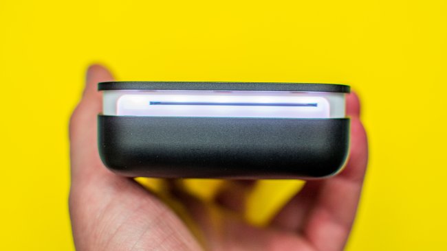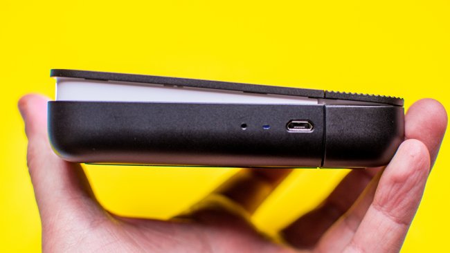 Auf den ersten Blick erinnert der Kodak Smile Printer an eine externe Festplatte: Mit Maßen von 11,7 x 8,1 x 2,3 Zentimetern passt das Gadget in jeden Rucksack oder sogar in die Hosentasche. Dazu ist das Gerät mit 200 Gramm angenehm leicht. Zum Laden des integrierten Akkus befindet sich auf der Oberseite ein microUSB-Anschluss, daneben eine Status-LED. Sie informiert über Ladezustand und Betriebsstand. Das Papierfach ist auf der linken Seite integriert. Dort finden die niedlichen 5,1 x 7,6 Zentimeter kleinen Papierstapel Platz. Das Einlegen klappt kinderleicht.