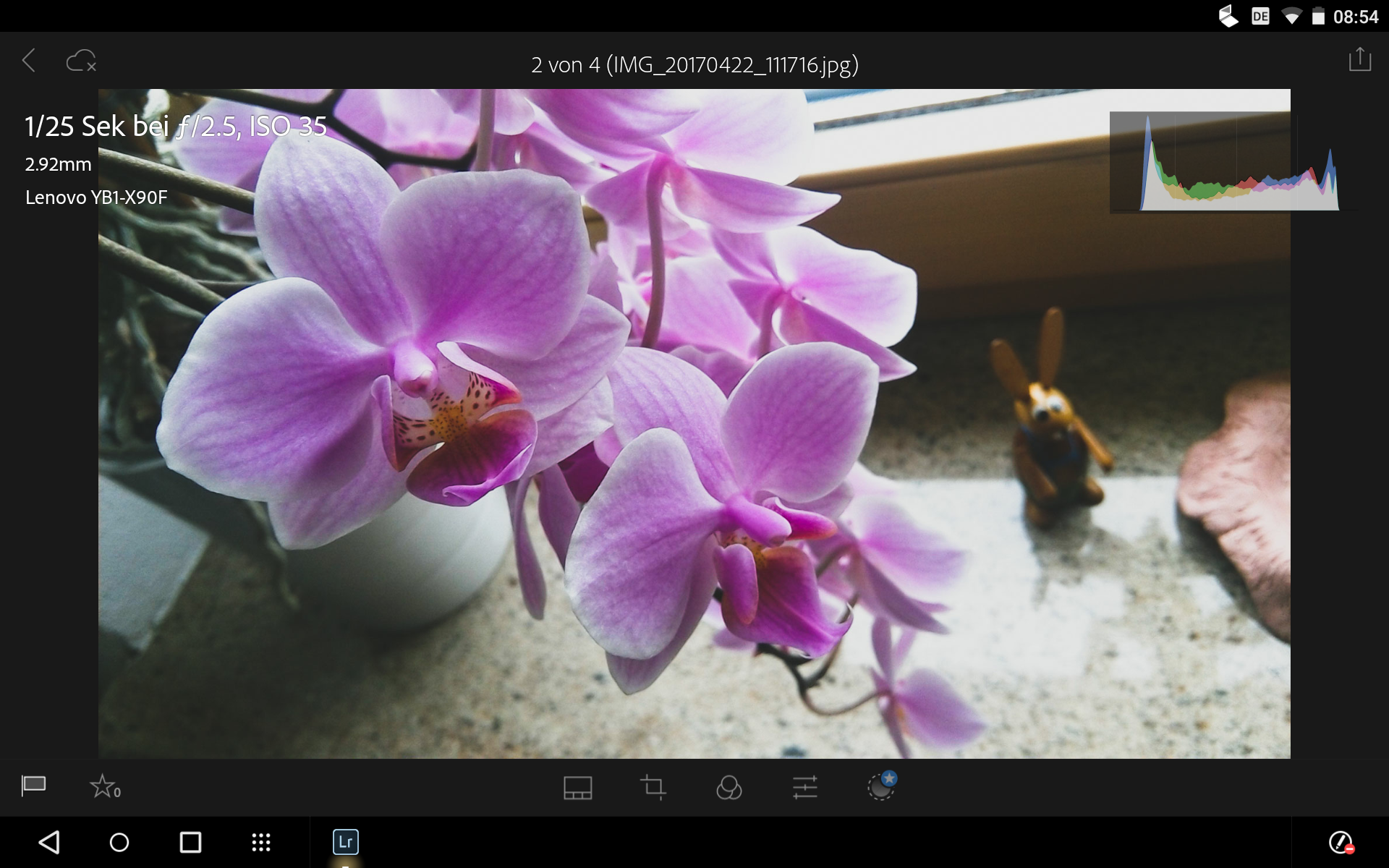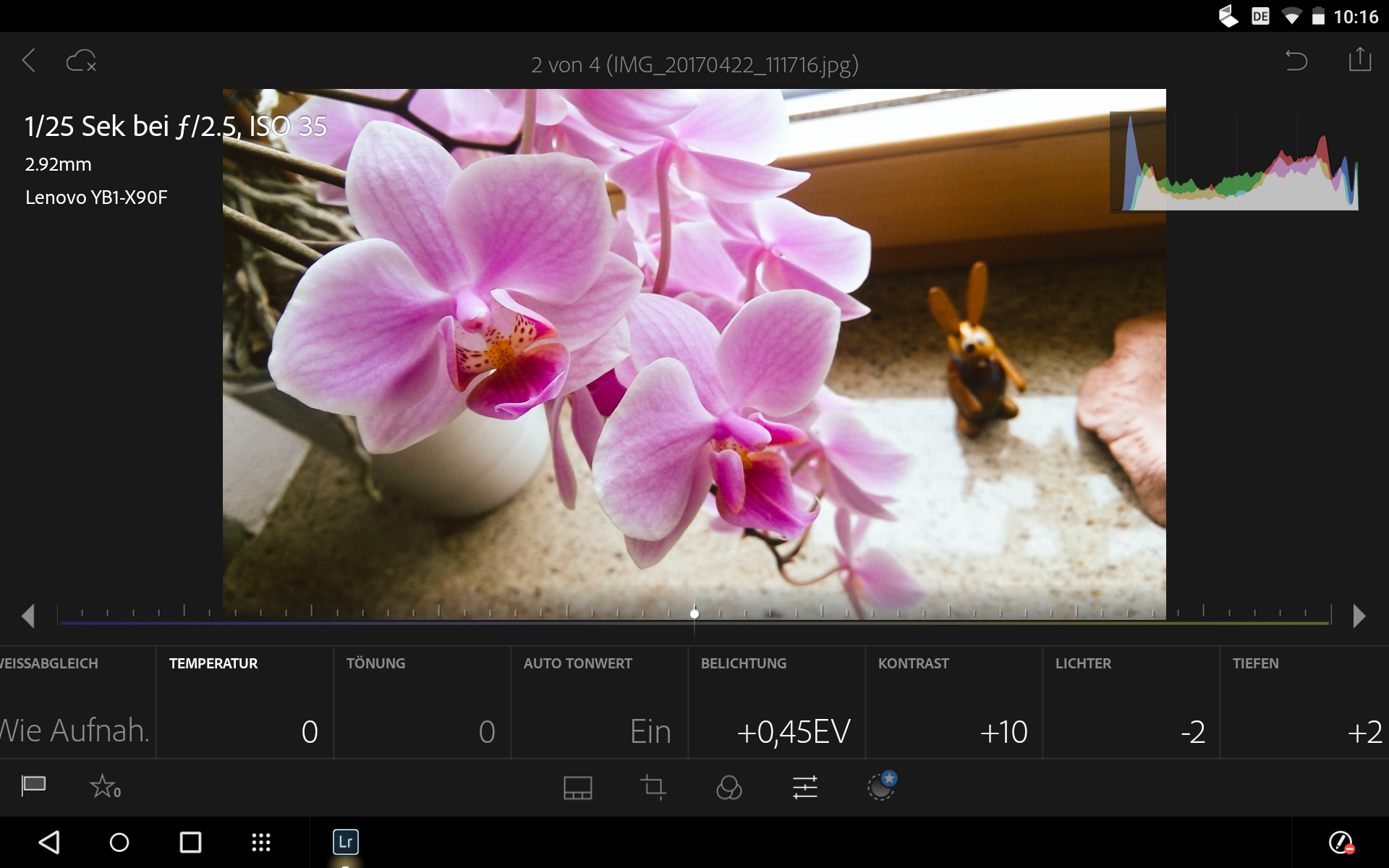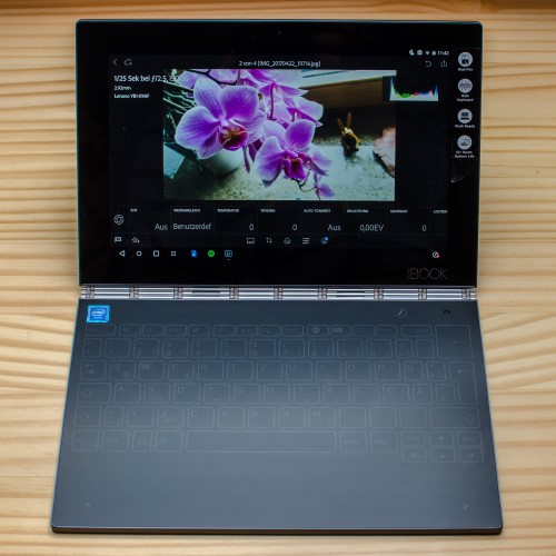 Adobe Photoshop Lightroom, auch nur kurz Lightroom, ist im Google Play Store in der Basisversion gratis verfügbar. Mit knapp 60 MB ist die Anwendung trotz des großen Funktionsumfangs kompakt gehalten. Besonders angenehm gestaltet sich die Verwendung der Adobe-App mit einem großformatigen Tablet. Deshalb haben wir den Workflow mit dem Lenovo Yoga Book durchgeführt, das für den Einsatz geradezu prädestiniert ist.
