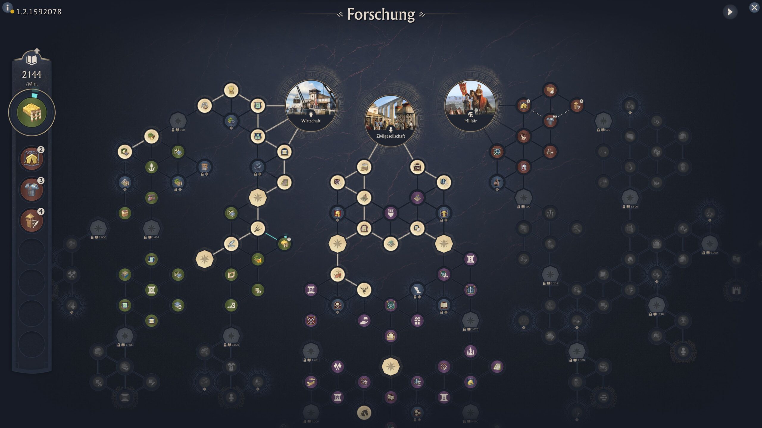 Die Bildung ist dagegen ein klassischer Forschungsbaum. In diesem warten 150 Entdeckungen auf uns. Diese können Verbesserung für den Kontor, neue Gebäude, Einheiten oder Straßenupgrades sein. Unterteilt ist der Forschungsbaum in Wirtschaft, Zivil und Militär und bestimmte Meilensteine schalten weitere Bereiche frei. Dabei sind einige Technologien auch exklusiv für Latium oder Albion.